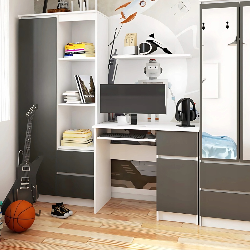 ✔️Wyposażone w pojemną szufladę (dł. 40 x szer. 24,2 cm) oraz szafkę (wys. 57 x szer. 32,8cm) rozmieszczone po lwej stronie oraz wysuwaną półkę na klawiaturę, pod blatem, oferują mnóstwo miejsca do przechowywania, co pozwala utrzymać uporządkowaną przestrzeń roboczą. Szuflady poruszają się na metalowych prowadnicach z rolkami, zapewniając płynne i bezproblemowe użytkowanie.