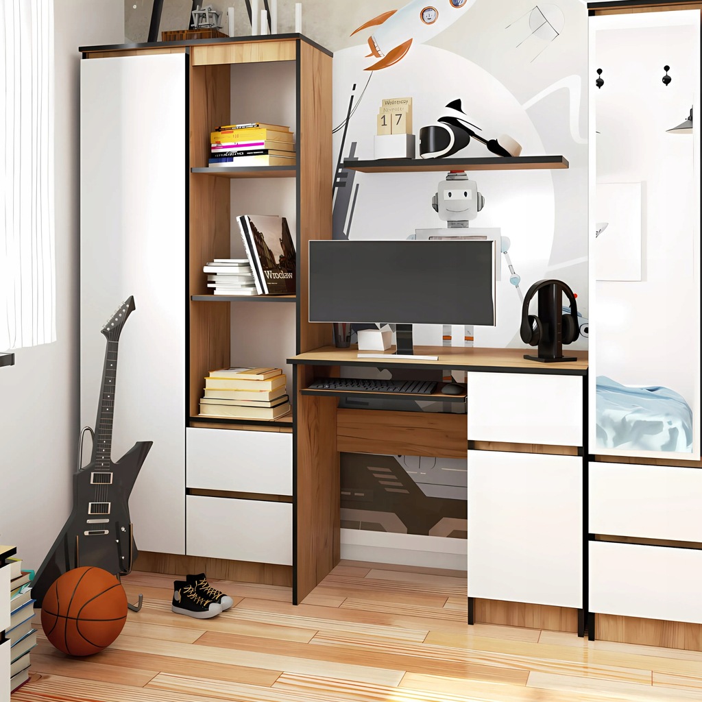 ✔️Wyposażone w pojemną szufladę (dł. 40 x szer. 24,2 cm) oraz szafkę (wys. 57 x szer. 32,8cm) rozmieszczone po lwej stronie oraz wysuwaną półkę na klawiaturę, pod blatem, oferują mnóstwo miejsca do przechowywania, co pozwala utrzymać uporządkowaną przestrzeń roboczą. Szuflady poruszają się na metalowych prowadnicach z rolkami, zapewniając płynne i bezproblemowe użytkowanie.