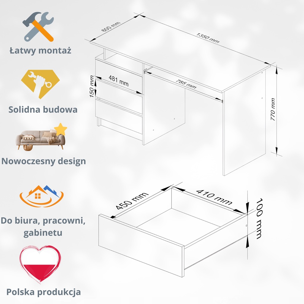 ✔️Nowoczesne i funkcjonalne biurko komputerowe, które doskonale sprawdzi się jako mebel do pracy, nauki czy gamingowej rozrywki. Dzięki wymiarom (dł. 60x wys. 77 x szer. 135cm) i przemyślanej konstrukcji, to biurko idealnie nadaje się do biura, pracowni, pokoju nastolatka czy domowego gabinetu.