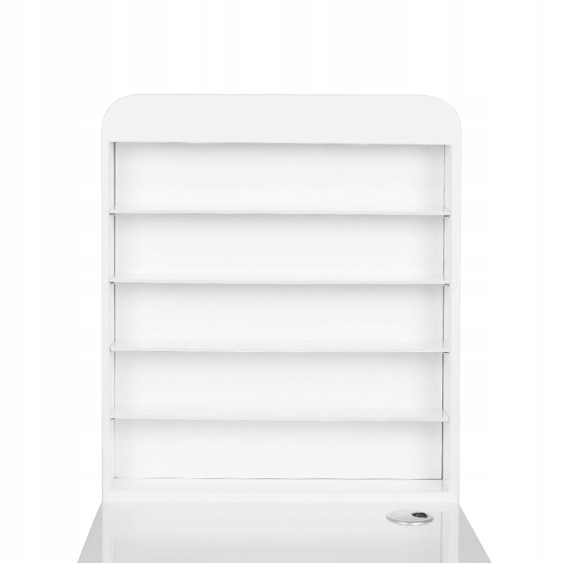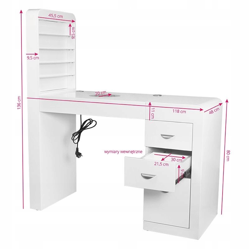 Biurko kosmetyczne z pochłaniaczem - bardzo funkcjonalny mebel do salonów kosmetycznych który łączy w sobie trzy funkcje: biurko, pochłaniacz pyłów oraz regał do ekspozycji lakierów itp Mebel idealnie komponujący się z wyposażeniem nowocześnie urządzonych pomieszczeń Posiada szafkę z pojemnymi szufladami Mebel został specjalnie zaprojektowany w taki sposób aby maksymalnie ułatwić pracę oraz zmniejszyć problem wystających kabli ( od lampek, frezarek, pochłaniaczy itp ) :- biurko w blacie ma specjalne otwory do poprowadzenia kabli,- dolna szafka pod ostatnią szufladą ma specjalne miejsce z wyjściem na kabel,- podświetlany regał ekspozycyjny, - otwory w blacie ( na kable ). - moc pochłaniacza 24W Wymiary:- wysokość: 80 cm, wysokość z regałem ekspozycyjnym: 136 cm- szerokość: 48 cm- długość: 118 cm