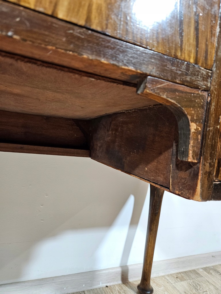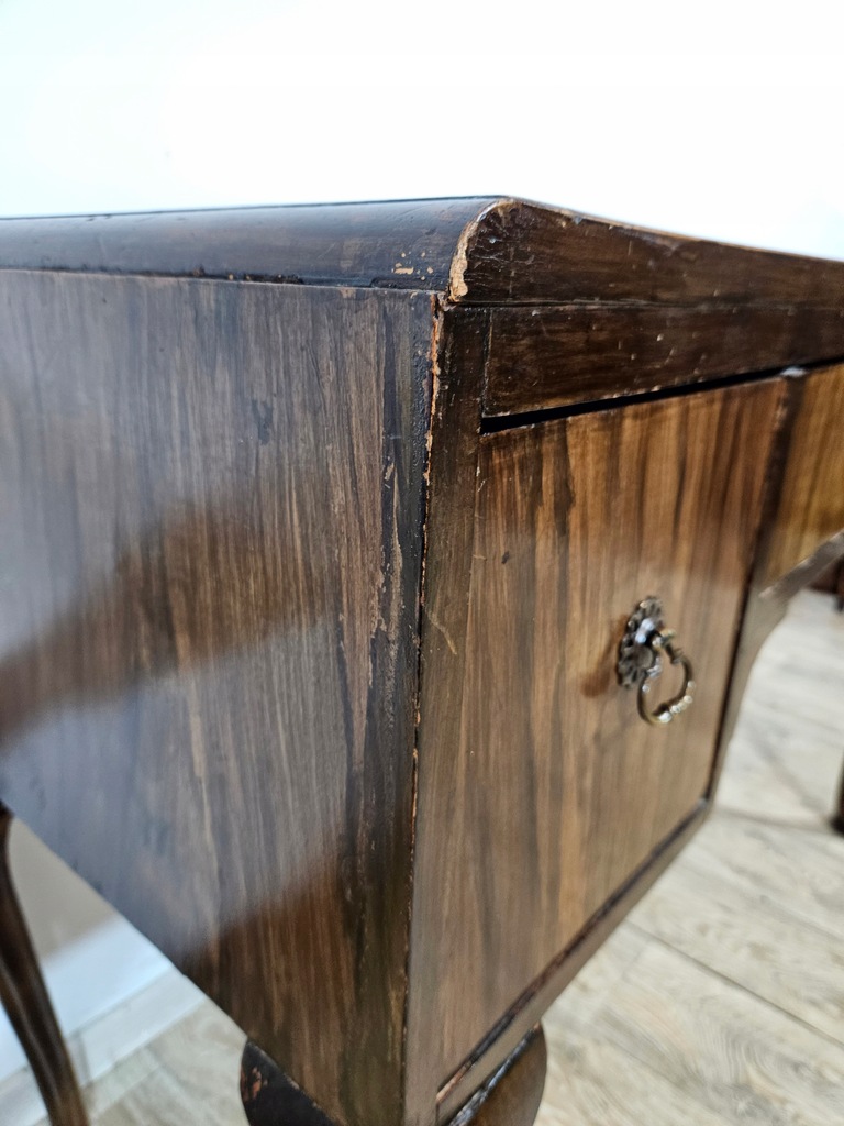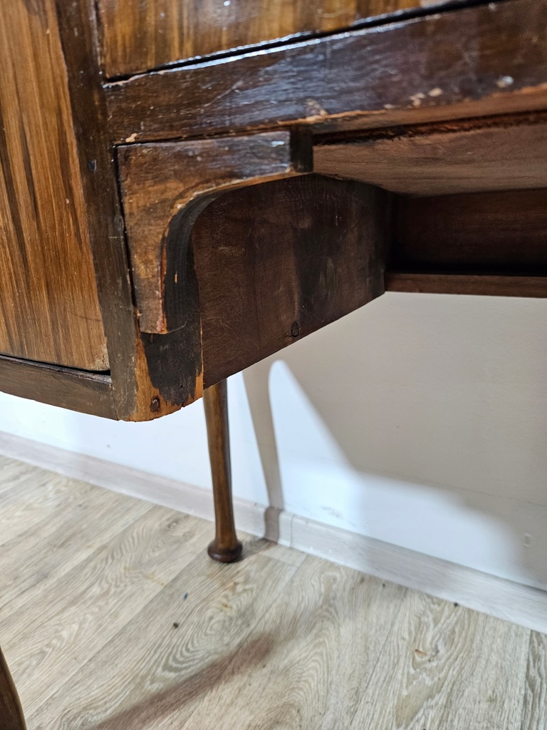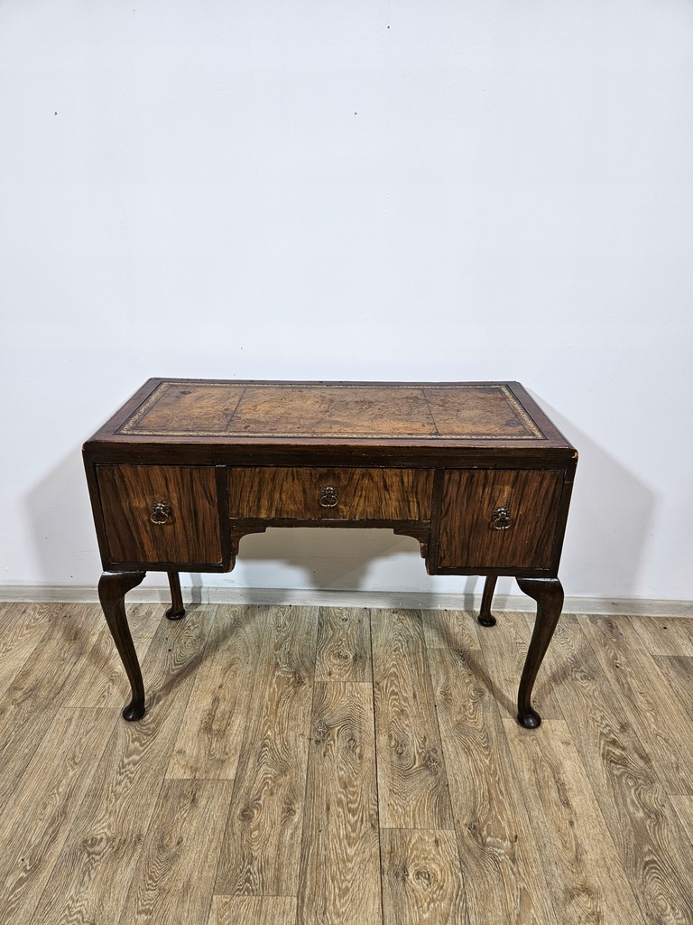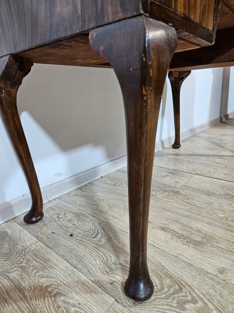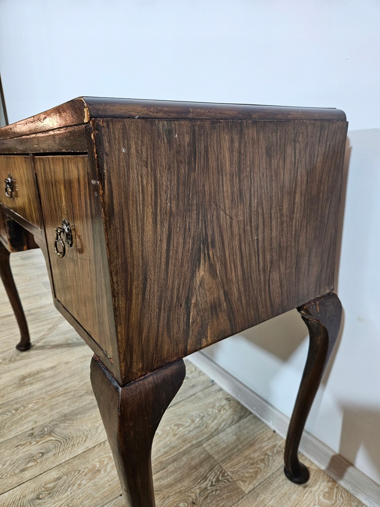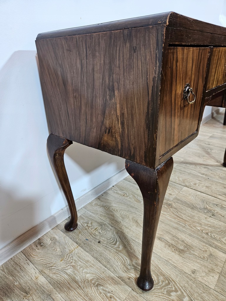 Biurko chippendale to urokliwy mebel, który charakteryzuje się giętymi nogami oraz posiada piękne zdobienia. Biurko wyposażone jest w trzy praktyczne szuflady, oferując dużo miejsca na przechowywania. Stan dobry, z widocznymi śladami użytkowania adekwatnymi do wieku. Do ogłoszenia dołączone są szczegółowe zdjęcia przedstawiające stan biurka.