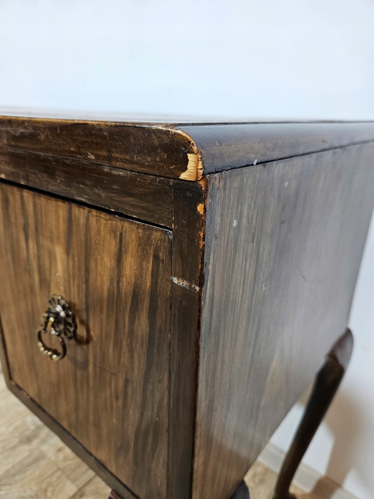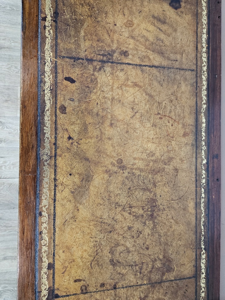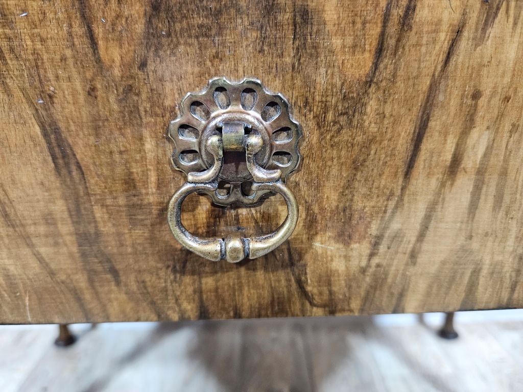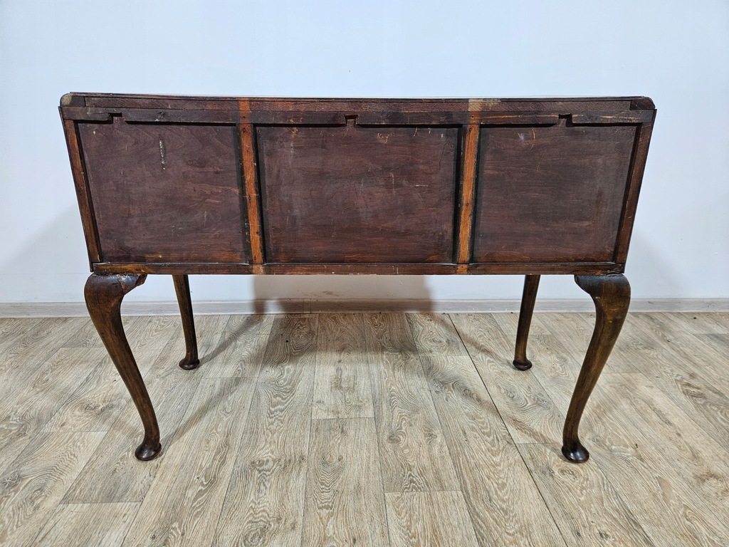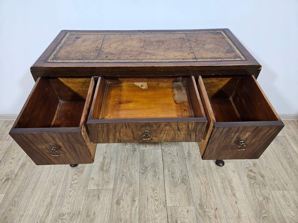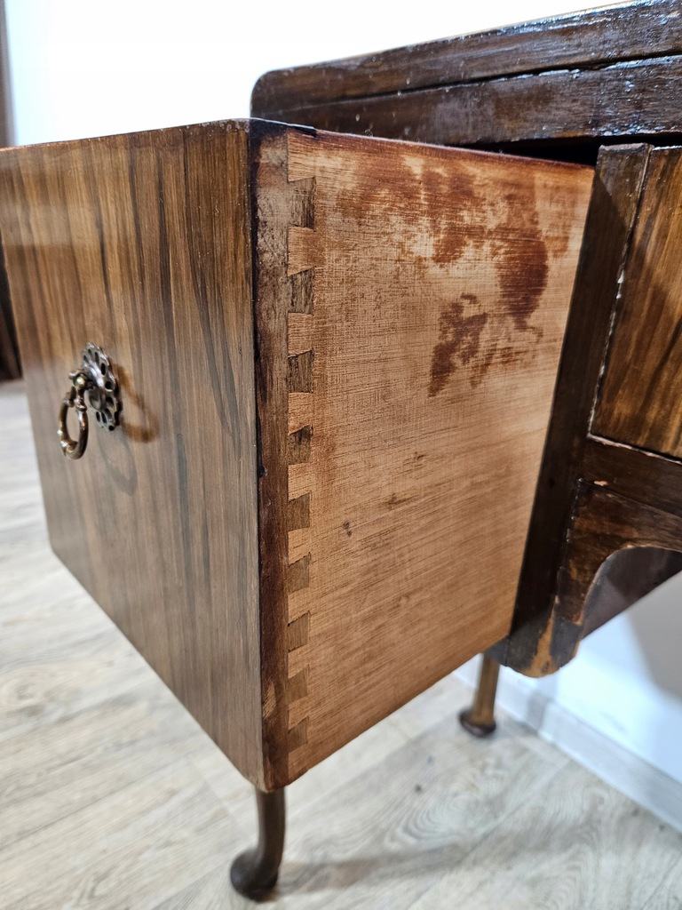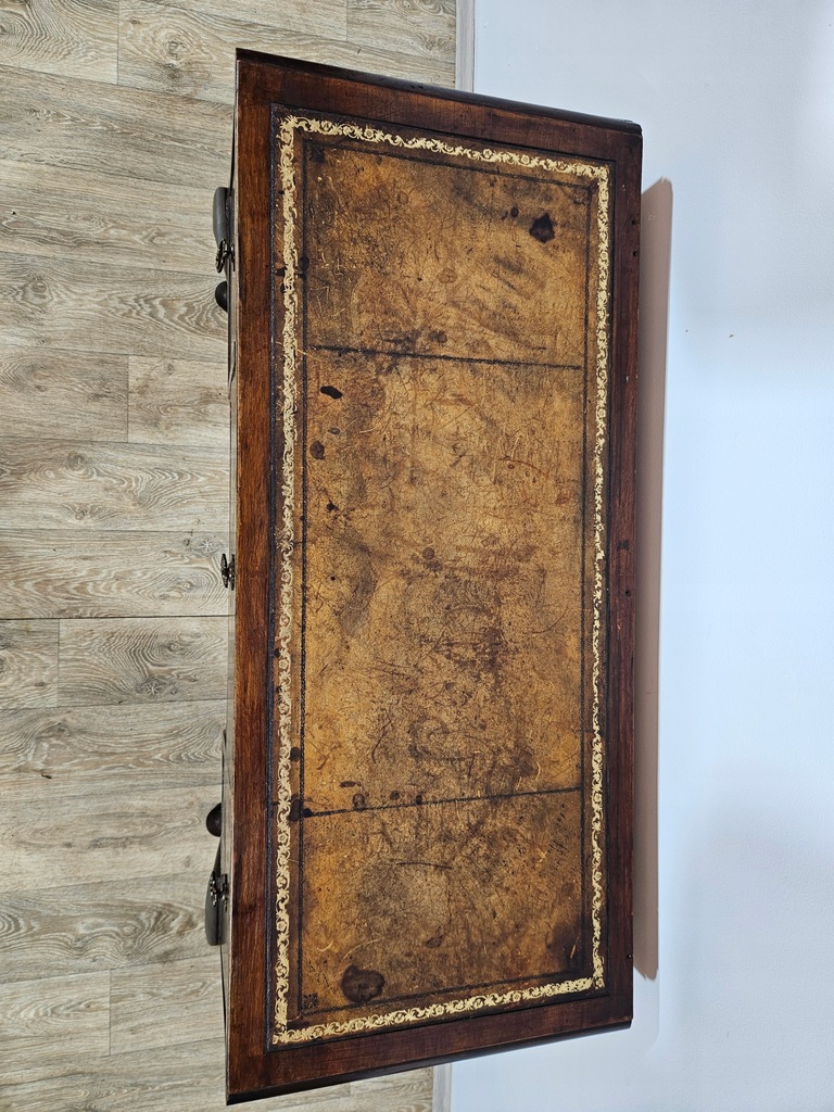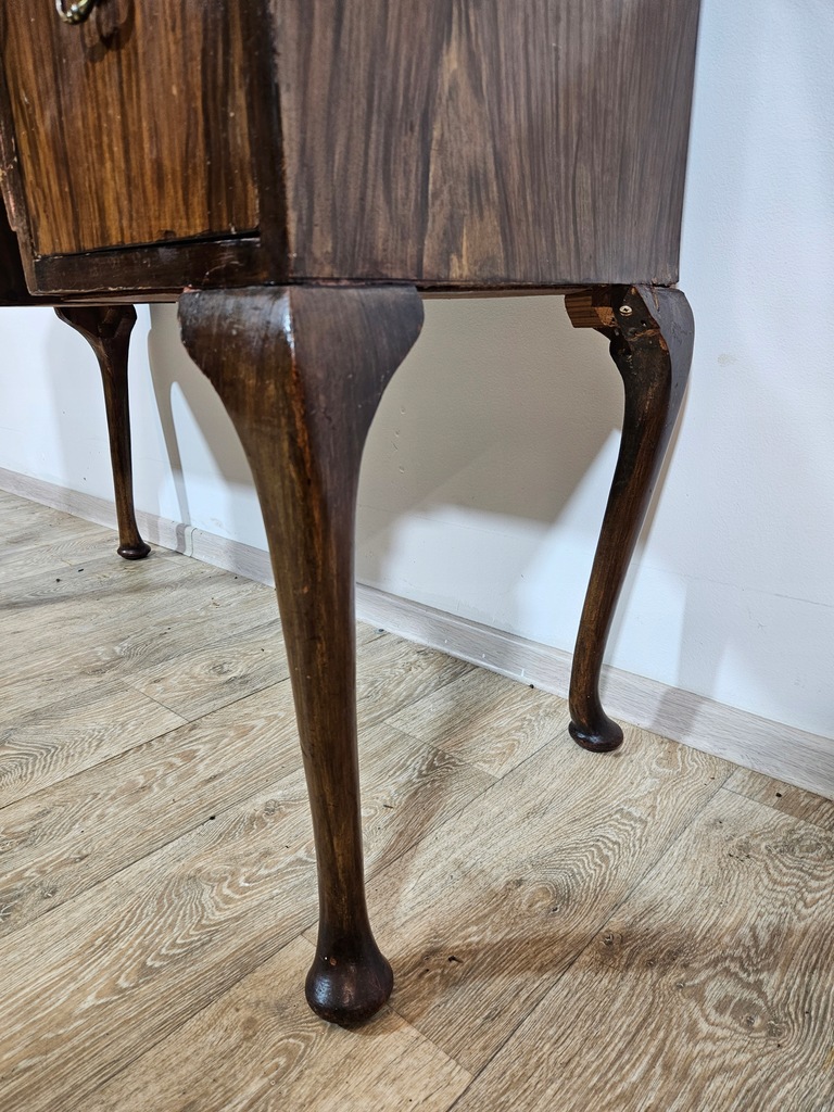 Biurko chippendale to urokliwy mebel, który charakteryzuje się giętymi nogami oraz posiada piękne zdobienia. Biurko wyposażone jest w trzy praktyczne szuflady, oferując dużo miejsca na przechowywania. Stan dobry, z widocznymi śladami użytkowania adekwatnymi do wieku. Do ogłoszenia dołączone są szczegółowe zdjęcia przedstawiające stan biurka.