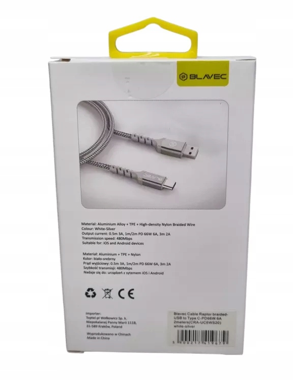 BLAVEC KABEL USB NA TYP CPD 66W 6A 2 METRY APPLE CARPLAY/ANDROID AUTO