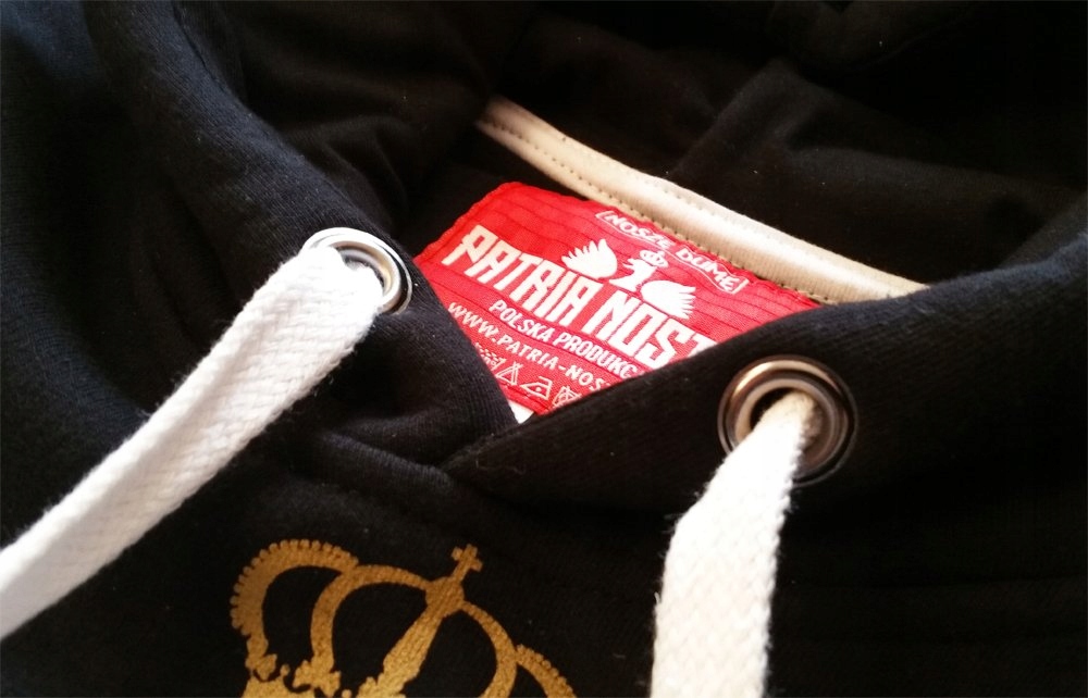 Bluza ozdobiona jest naszymi stałymi dodatkami w postaci firmowych żakardów oraz naszywki. Posiada przy tym swój unikalny, wykonany od podstaw krój. Sznurki do kaptura to biały kolor, kontrastujący z materiałem i akcentujący dodatkowo białego orła. Bluza uszyta została z najwyższej jakości materiałów od polskich dostawców.
