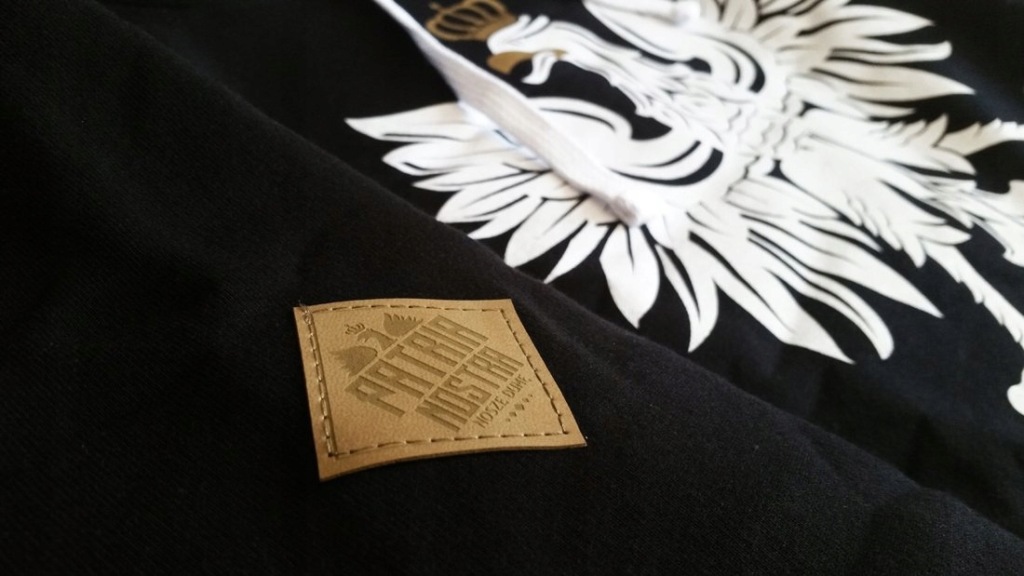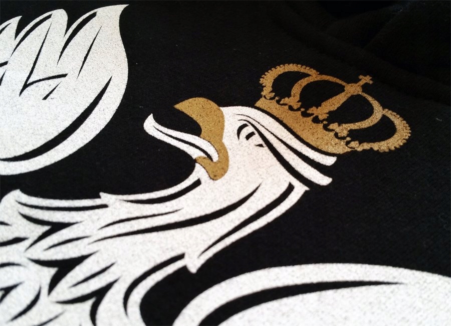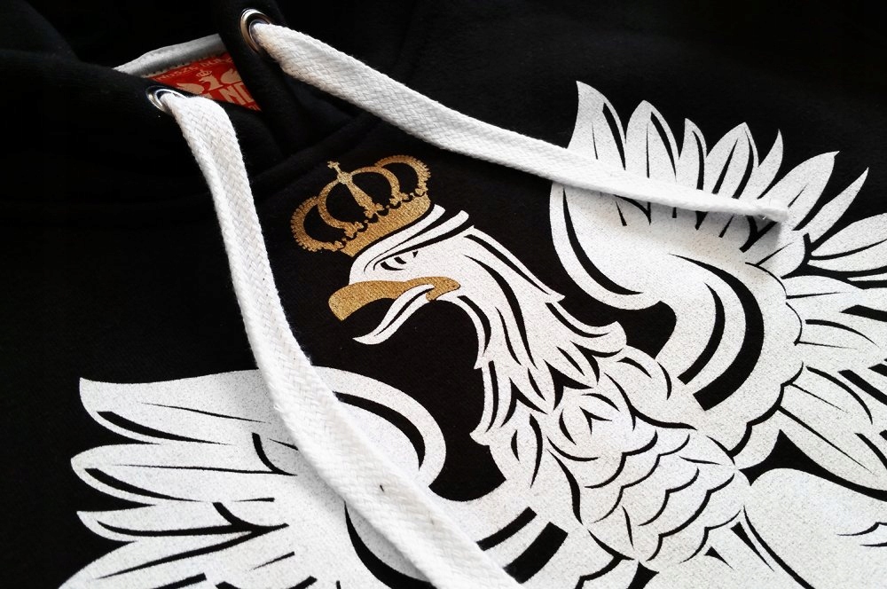 Nadruk z przodu wykonany jest mieszanymi metodami sitodruku. Dla dodatkowego wyróżnienia dumy polskiego, białego orła użyliśmy złotej farby (brokatowa) dającej efekt połysku. Do jak najlepszego odwzorowania i intensywności bieli postanowiliśmy nałożyć 2 warstwy farby.