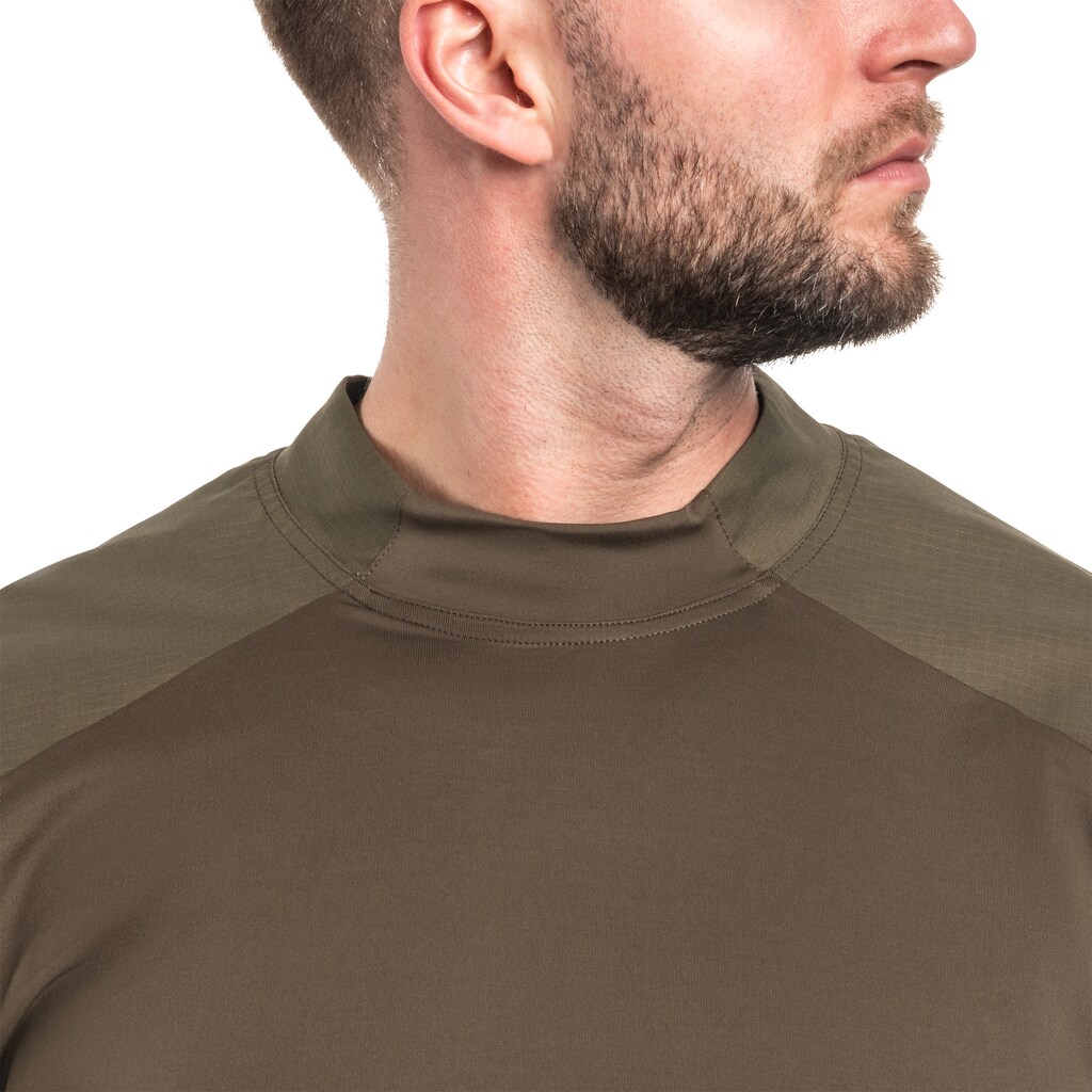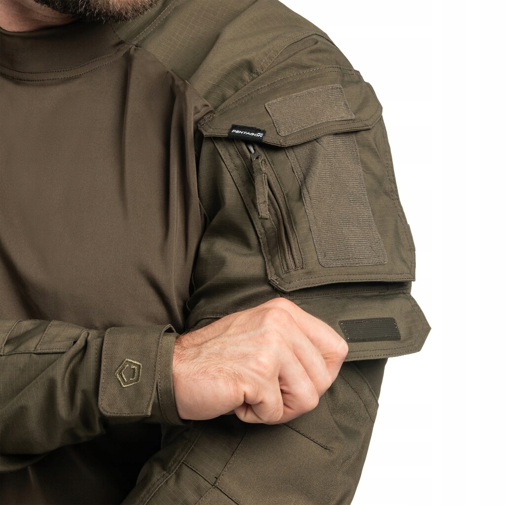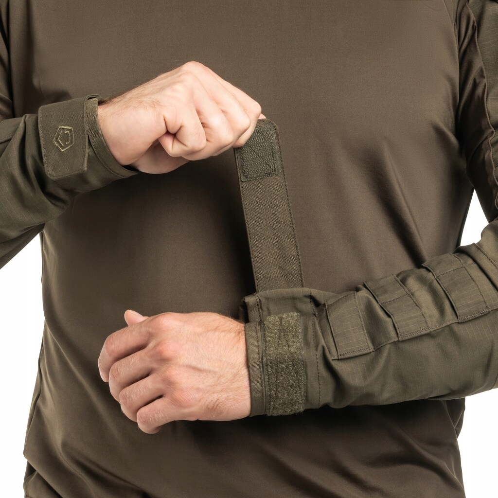 Profesjonalna bluza typu combat shirt, wyprodukowana z wykorzystaniem najnowocześniejszy standardów, gwarantuje komfort, swobodę ruchów i niezawodność. Materiał na rękawach to trwałe spojenie poliestru i bawełny o strukturze ripstop, z elastycznym dwukierunkowym rozciąganiem, idealnym nawet w najbardziej ekstremalnych warunkach. Segment tułowia wykonano z lekkiego i odpornego na ścieranie materiału, gwarantując długotrwałość i komfort noszenia. Dolną część bluzy wzbogacono o elastan, co zapewnia odpowiednie dopasowanie i odporność na deformacje.