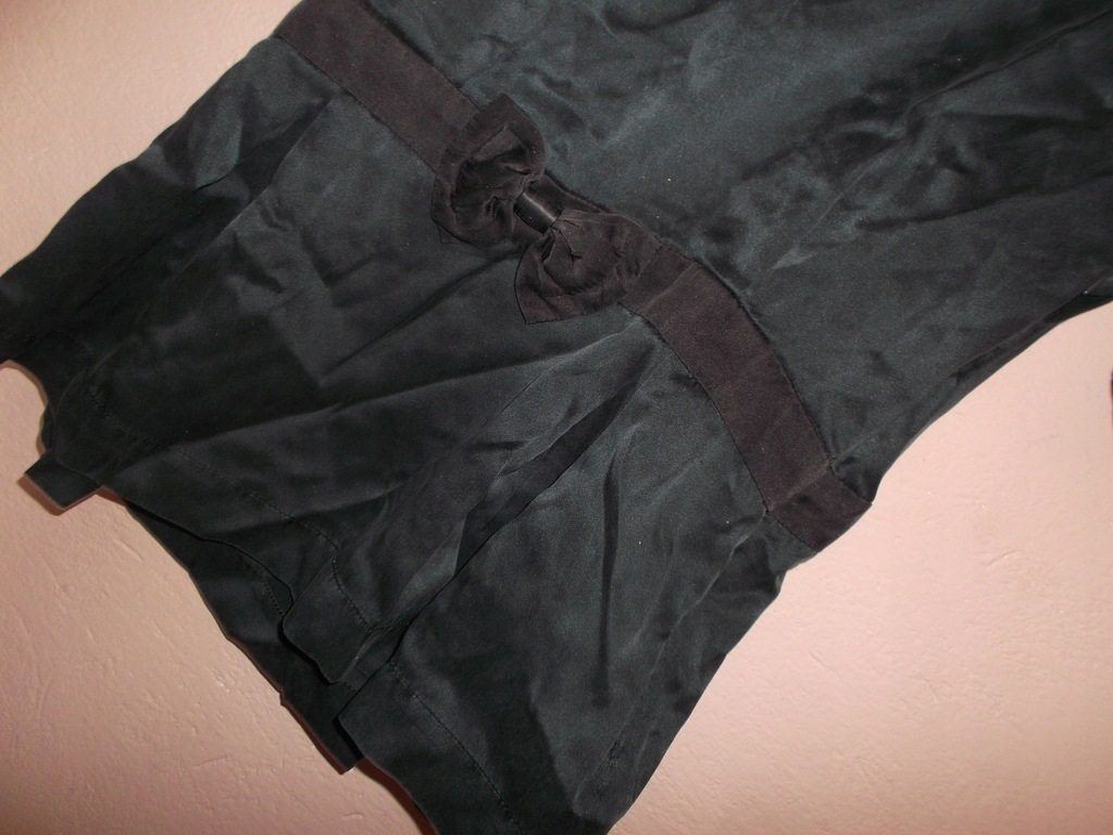 Bluzka ma zgrabny taliowany fason, ze względu na lejący materiał ładnie dopasowuje się do sylwetki, ma w pasie wszyty czarny pasek z ozdobną kokardką z przodu, części od pasa do góry i do dołu są wszyte do tego paska z dwoma zakładkami z tyłu i z przodu.