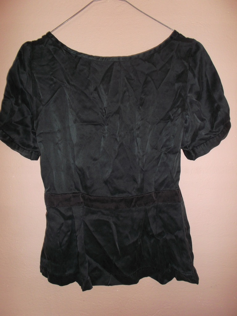 Sprzedaję w bardzo dobrym stanie markową, damską, luksusową, delikatną i przewiewną bluzkę wizytową z krótkim rękawem z materiału o składzie 100 % naturalny jedwab w kolorze ciemnozielonym.