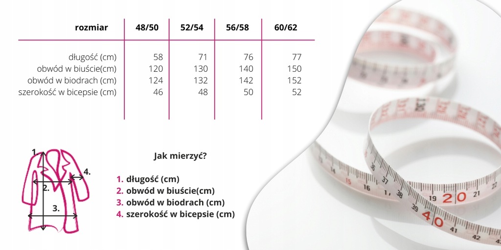 Rozmiar 56/58 obwód w biuście 136 cm, obwód w biodrach 150 cm, długość 75 cm, długość rękawa 40 cm, biceps 62 cm
