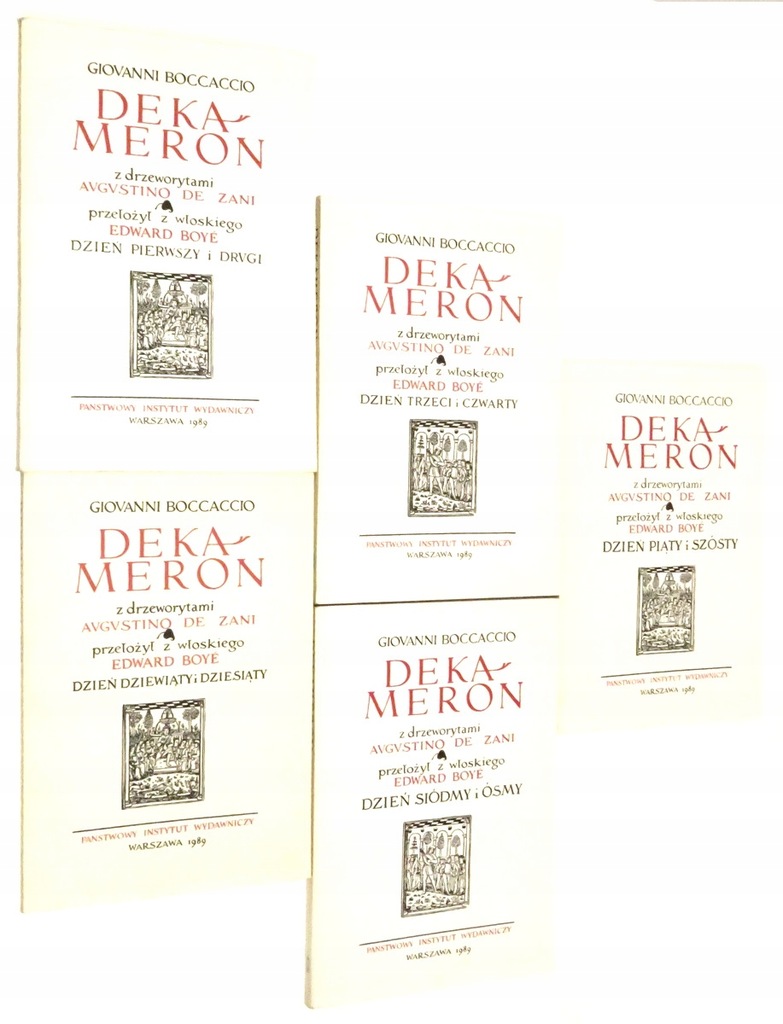 Stan: dobry, okładki z niewielkimi otarciami, przybrudzeniami i przygięciem jednego z tylnych rogów w tomie 1 i 5, bloki książek lekko przybrudzone, w tomie 1 blok wydawniczo krzywo przycięty (grzbiet jest pod skosem)