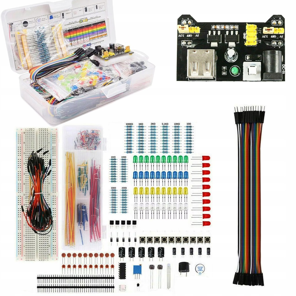 Kompletny zestaw komponentów elektronicznych, w tym moduły, czujniki, przewody, rezystory, LED-y, przyciski, i wiele innych, które umożliwiają realizację praktycznie każdego projektu DIY.