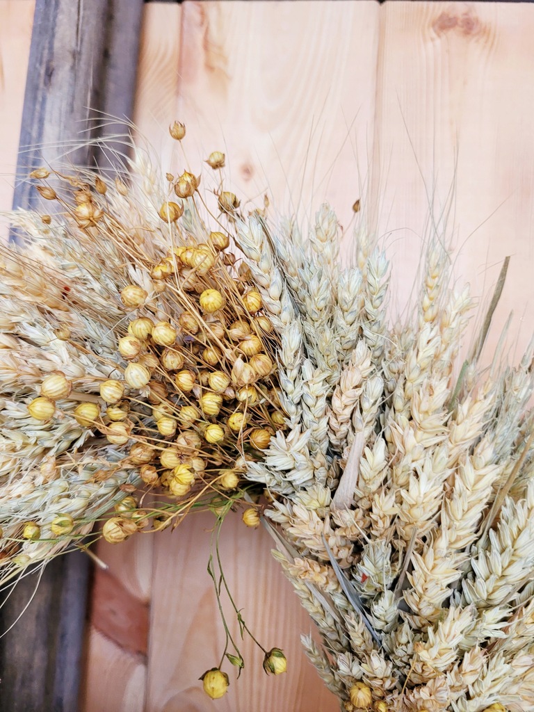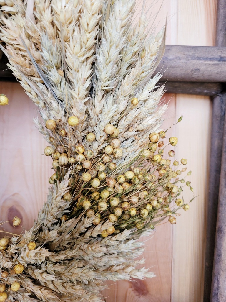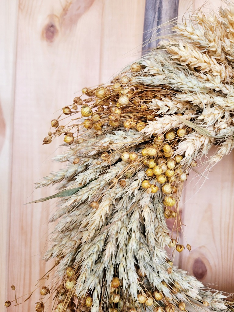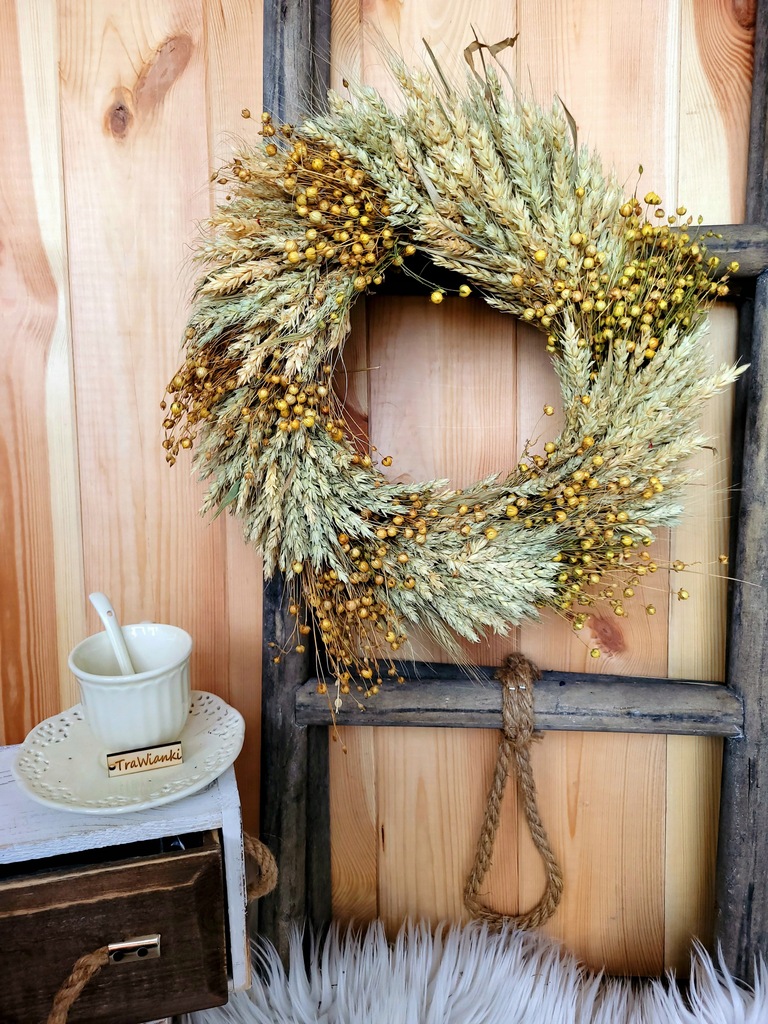 Ręcznie wykonany wianek ze zbóż i lnu. Średnica wianka około 34 cm. Wianek wykonany na słomianej bazie, dzięki temu zawieszenie wianka nie sprawia żadnego kłopotu. Przepięknie komponuje się we wnętrzach w stylu boho, rustic. Idelany jako pomysł na prezent. Wykonany z naturalnych suszonych roślin tj. zbóż i lnu. Wianek opatrzony w drewnianą metkę i ładnie zapakowany. Rękodzieło, zapraszam serdecznie