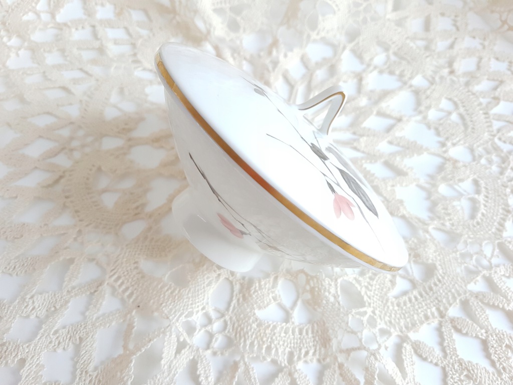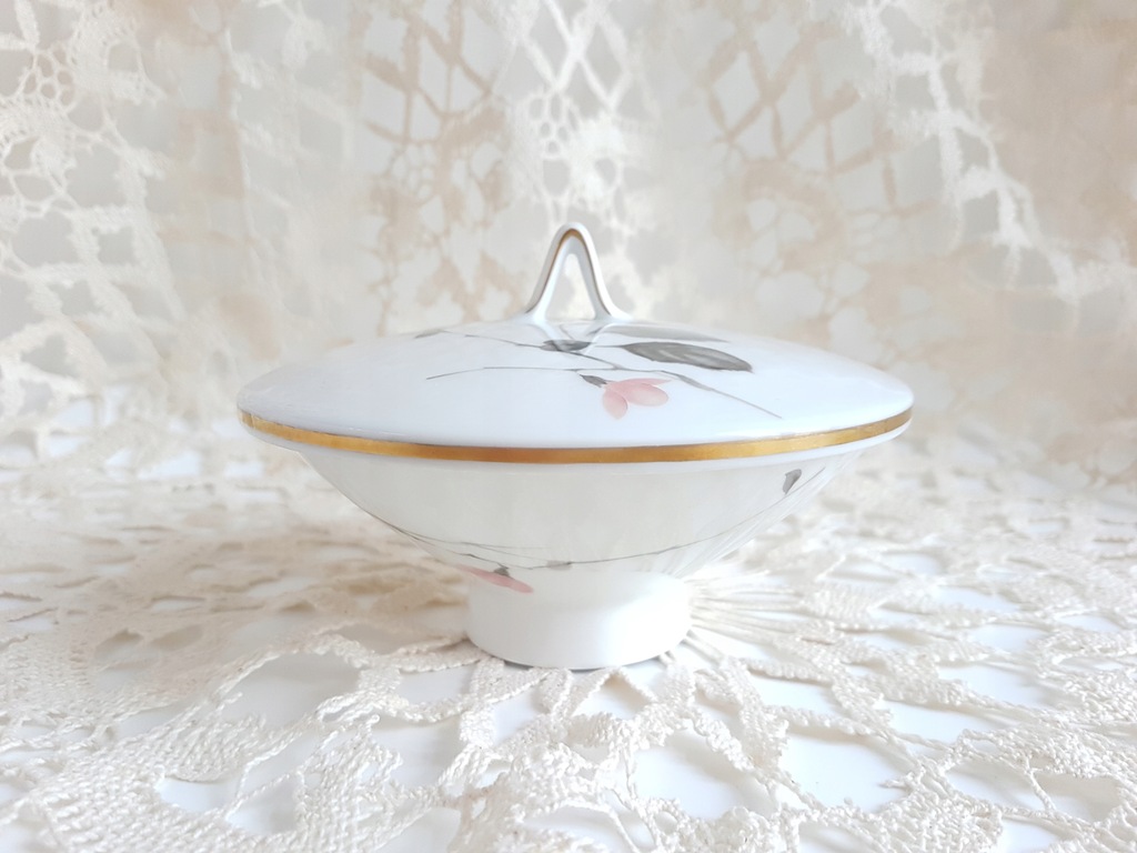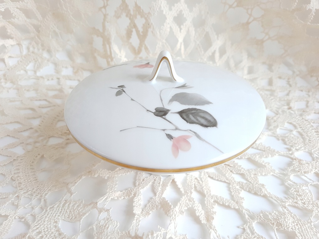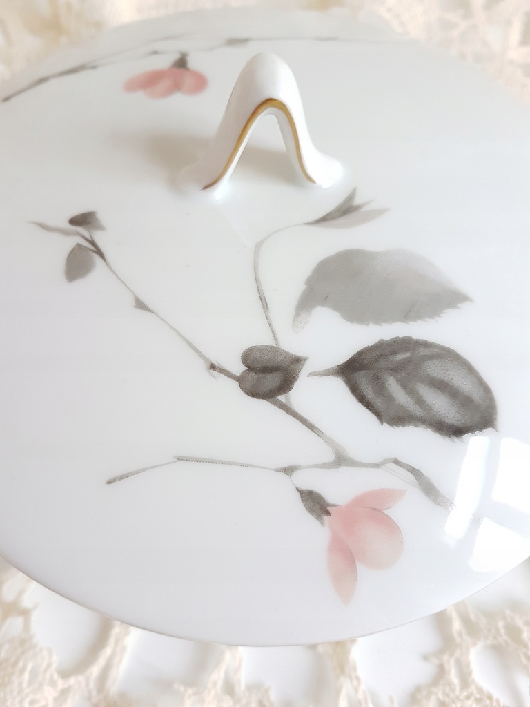 Porcelanowa bomboniera w stylu lat 60-tych z bawarskiej manufaktury Rosenthal. Zdobiona delikatnym, szaro-różowym dekorem kwiatowym.