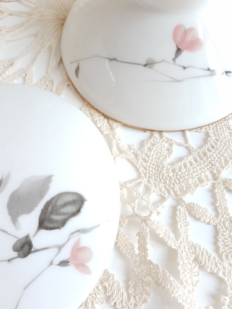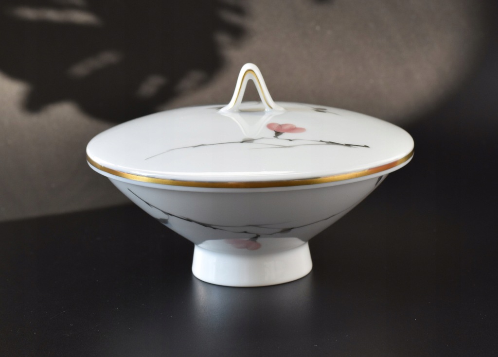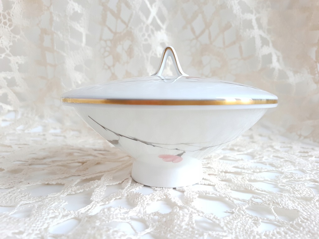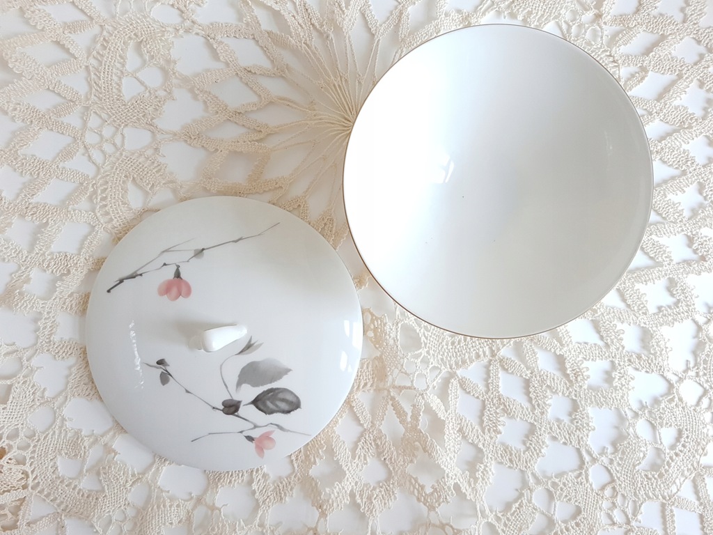 Porcelanowa bomboniera w stylu lat 60-tych z bawarskiej manufaktury Rosenthal. Zdobiona delikatnym, szaro-różowym dekorem kwiatowym.