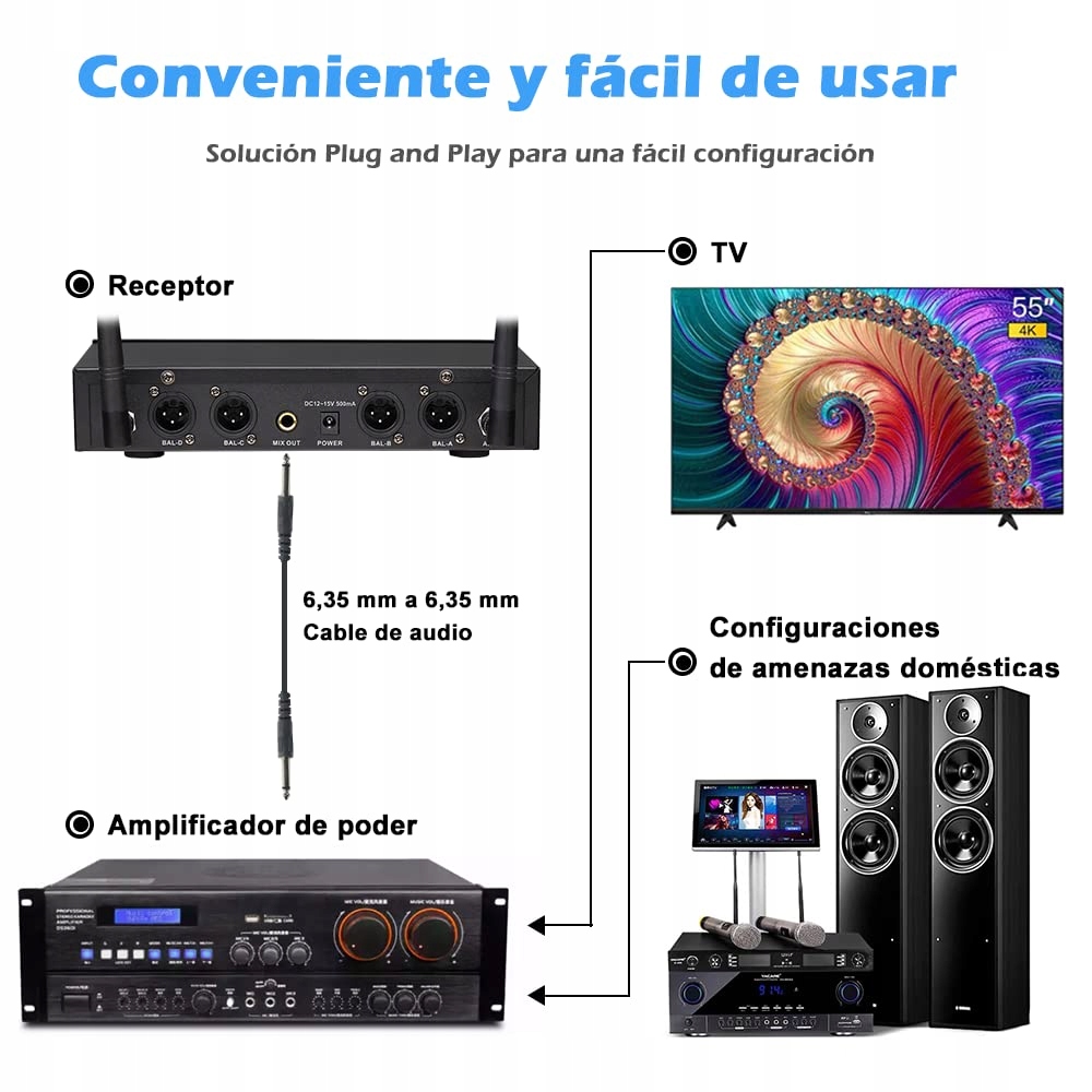 - 4-kanałowy profesjonalny bezprzewodowy system mikrofonowy UHF: z częstotliwością UHF, maksymalna odległość połączenia mikrofonu wynosi około 265 stóp (80 metrów)