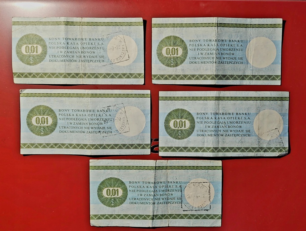 5 bonów towarowych PKO o nominale 1 centa 1979 r.