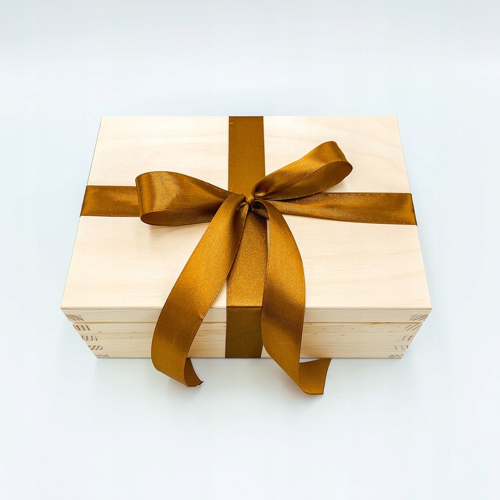 Pudełko przewiązane w elegancki sposób złotą / miedzianą wstążką.