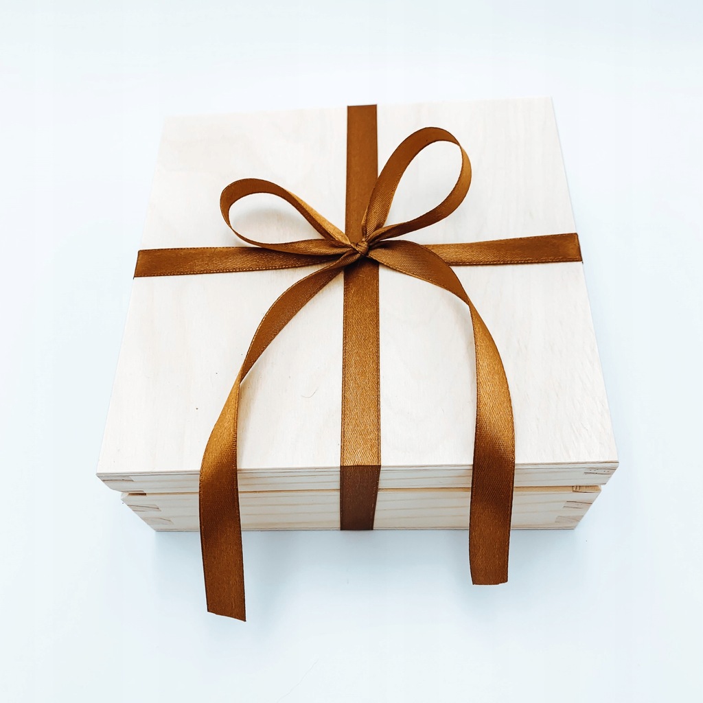 Pudełko przewiązane w elegancki sposób miedzianą wstążką.