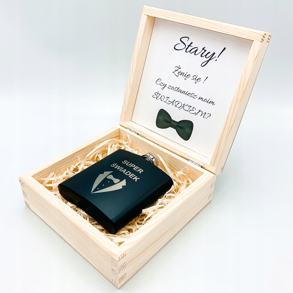 Drewniane pudełeczko w formie prośby o świadkowanie. Wewnątrz znajduje się etykieta z napisem widocznym na zdjęciu. Przedstawiony GiftBox to wyjątkowy i oryginalny prezent, który na pewno zachwyci każdego świadka.