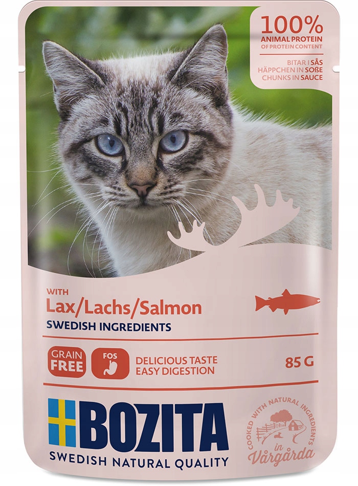 Kawałki w sosie z łososiem. Nasz łosoś pochodzi z dzikich wód na północy Szwecji. Zawiera z natury dużą ilość kwasów Omega 3 i 6 oraz cechuje się szczególnym i bardzo lubianym smakiem.