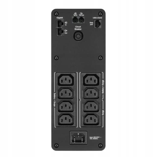 - Gniazda zasilające z podtrzymaniem akumulatorowym i ochroną przeciwprzepięciową. Podtrzymanie zasilania i ochrona sprzętu oraz danych na wypadek przerw w dostawie energii, przepięć oraz skoków napięcia.