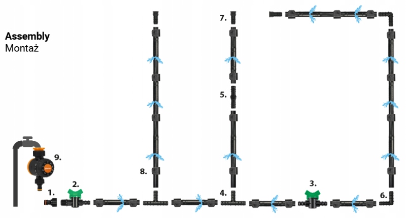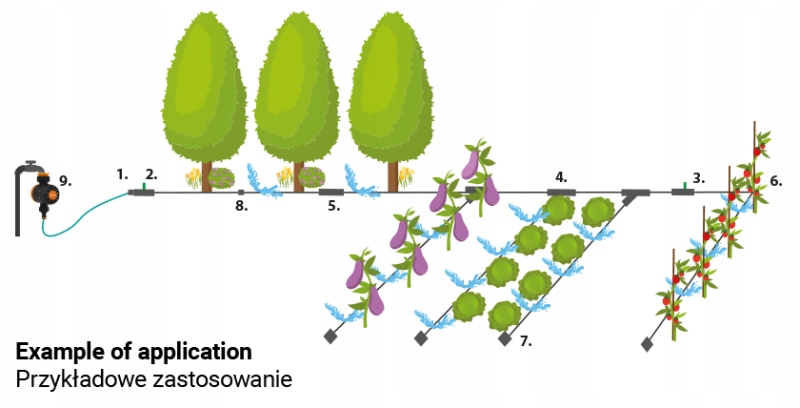 Wydajność jednego kroplownika: 2l/h przy ciśnieniu 1 BAR