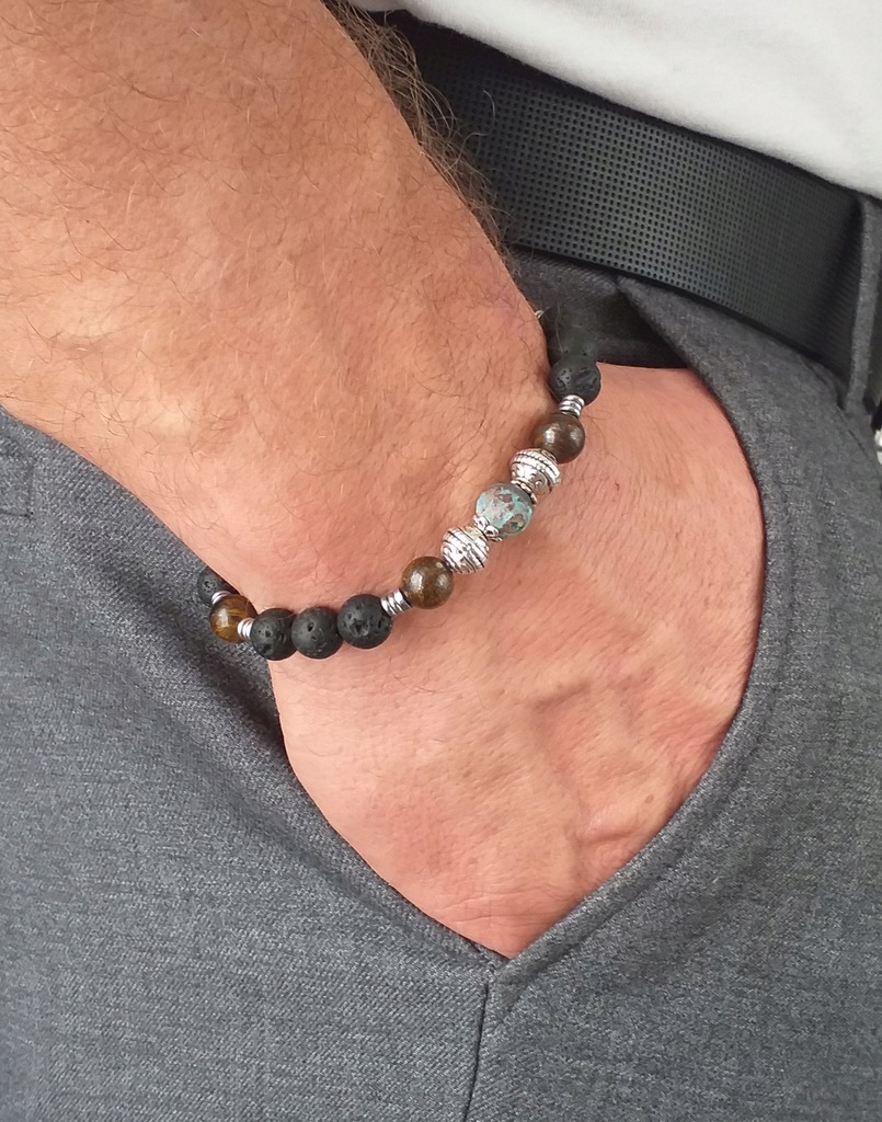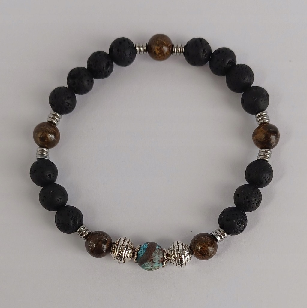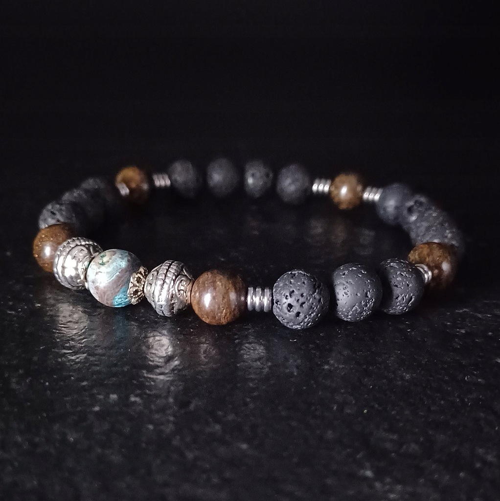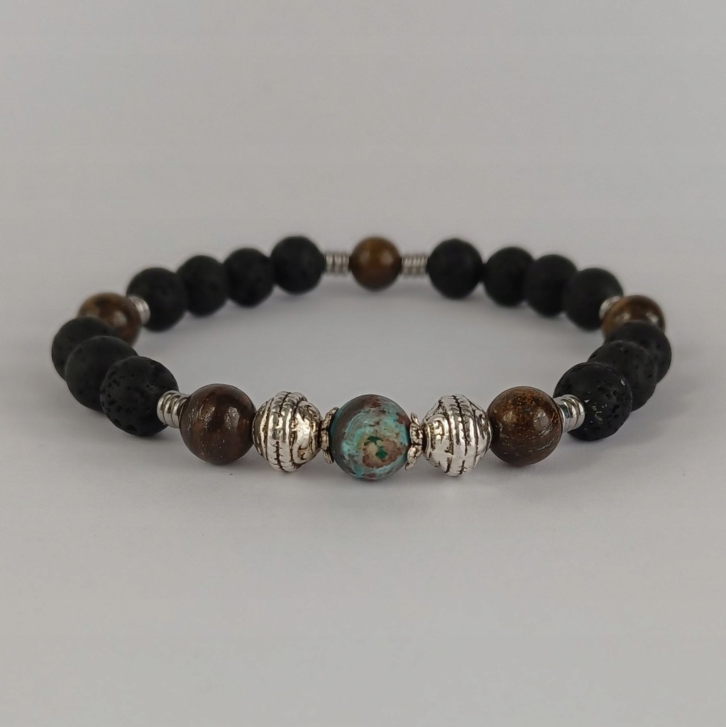 Bransoletka została ręcznie wykonana z kamieni półszlachetnych, ozdobiona okrągłymi przekładkami z hematytu oraz stali w kolorze srebra.