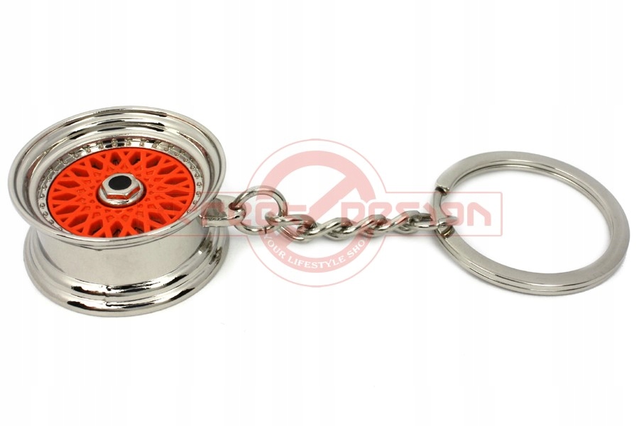 Brelok wzorowany na feldze BBS RS w kolorze chrom z pomarańczowym rotorem, wykonany z metalu.