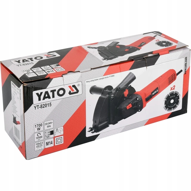Dane techniczne:Numer indeksu:YT-82015Moc [W]:1700Prędkość obrotowa [1/min]:10500Uniwersalna bruzdownica, której można używać do wycinania bruzd i cięcia bezpyłowego po podłączeniu do odkurzacza lub jako mocnej szlifierki kątowej po zdjęciu osłony do bruzdowania i założeniu standardowej osłony tarczy szlifierki kątowej (nie dołączono w kpl.)Przystosowana do pracy w ścianach, sufitach i posadzkach pod montaż kabli, rur c.o., instalacji alarmowych i teletechnicznych oraz automatyki sterującej budynkówTrwała i prosta w obsłudzeCechy charakterystyczne maszyny:Wysoka moc 1700W generowana przez komutatorowy silnik z miedzianym uzwojeniemŁatwa wymiana tarczMożliwość bruzdowania w narożnikach wewnętrznych (uchylana osłona z przodu maszyny)Pełna obudowa pozwala na skuteczne odsysanie pyłu przy uzyciu odkurzaczaTarcze diamentowe (125mm x 2szt) dołączone w kplRegulowana szerokość i głębokość cięcia (max 38mm x 38mm)Wygodny i bezpieczny włącznikSzybkie cięcie w żelbecie i ergonomicznie położony środek ciężkości niwelują zmęczenie operatoraWysoka jakość wykonania i trwałość detali (gumowy kabel, pierścienie redukcyjne do regulowania rozstawu tarcz)2 x Tarcze diamentowe 125mm**
