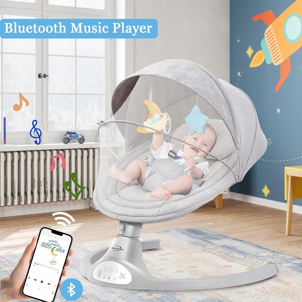 Ta huśtawka dla dzieci ma 10 predefiniowanych kołysanek. Możesz także połączyć się z telefonem przez Bluetooth, co umożliwi odtwarzanie muzyki lub opowieści, które ukoją Twoje dziecko i zapewnią mu chwile spokoju lub radości.