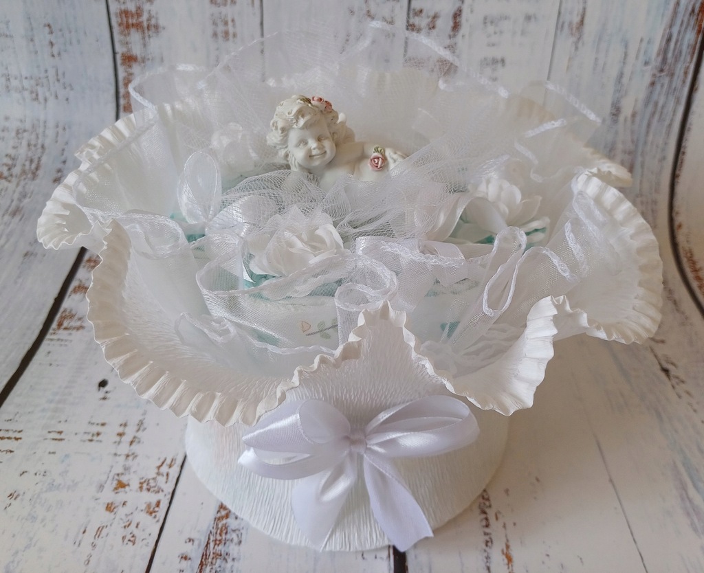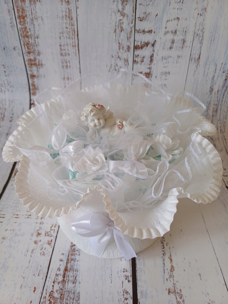 - białej dekoracji z kwiatków i kokardek