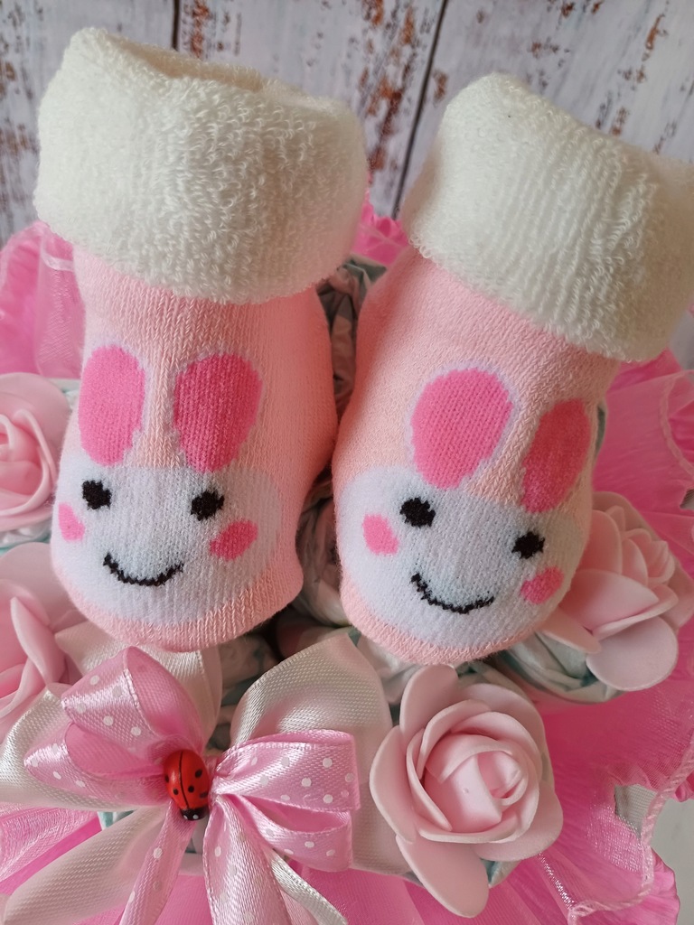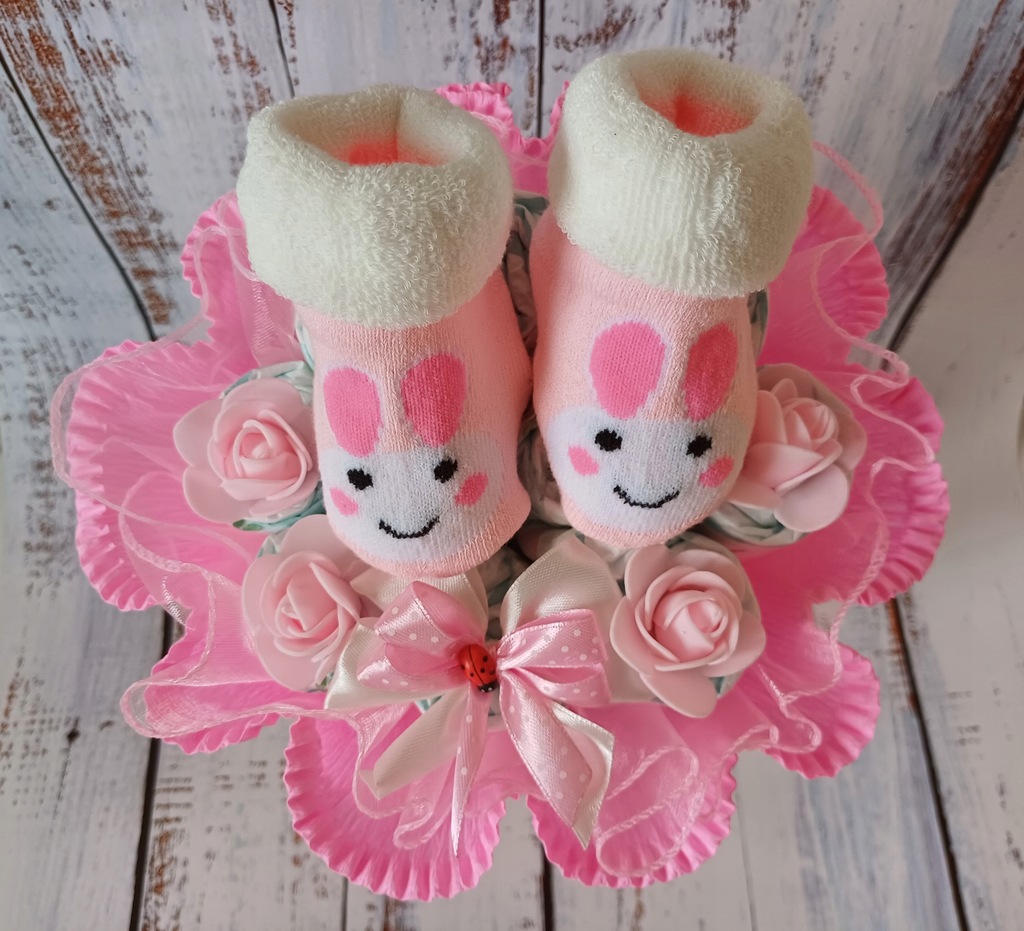 Bukiet z pampersów z bawełnianymi skarpeteczkami