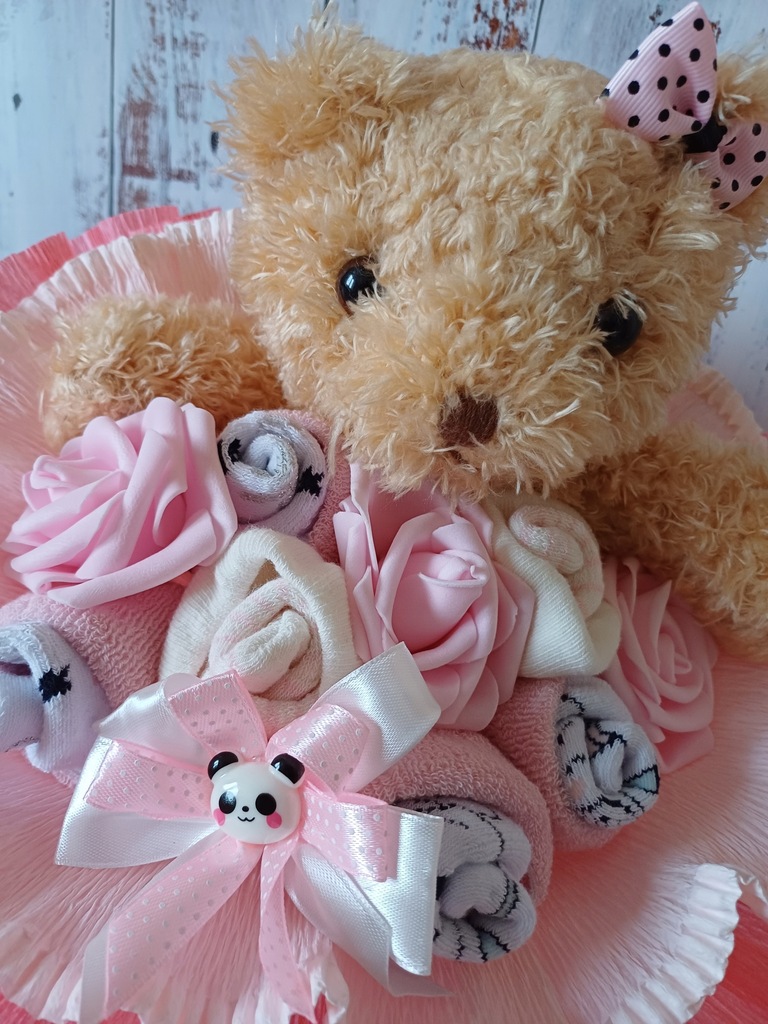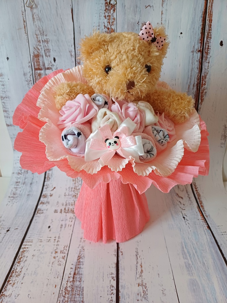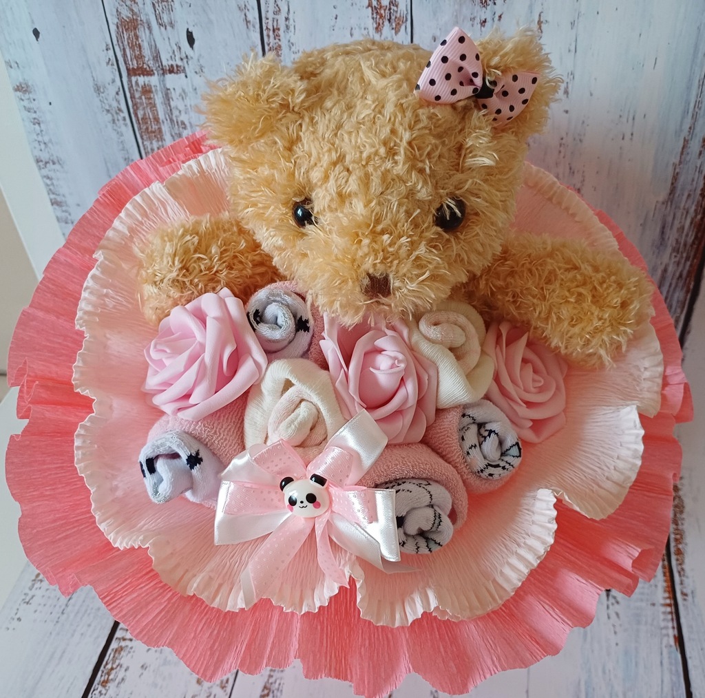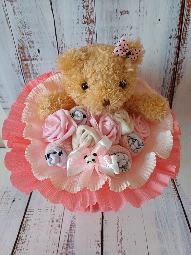 Przepiękny bukiet z maskotką i 3 parami skarpeteczek w rozm. 15-18.