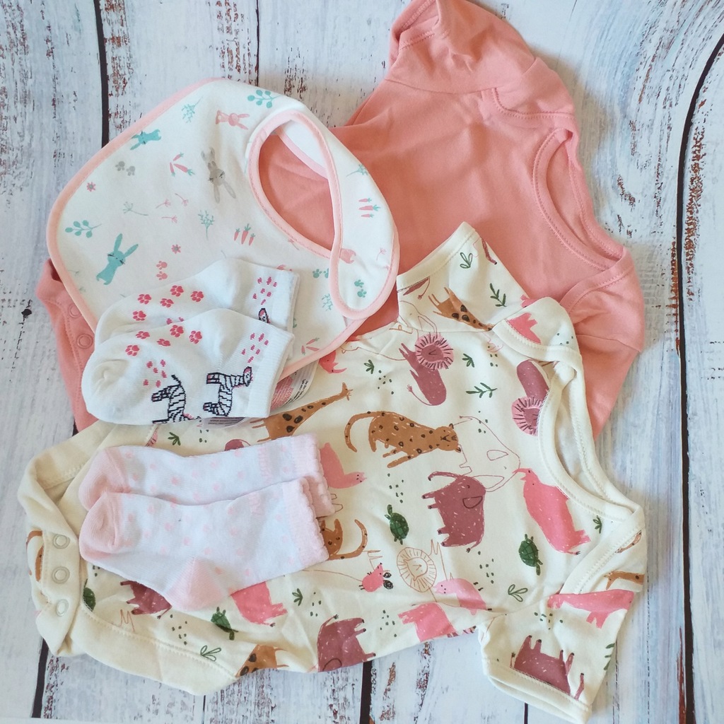 W skład kompozycji wchodzą ubranka w rozmiarze 74cm (6-9 miesięcy) oraz pampersy nr 3 ( 4-9 kg)