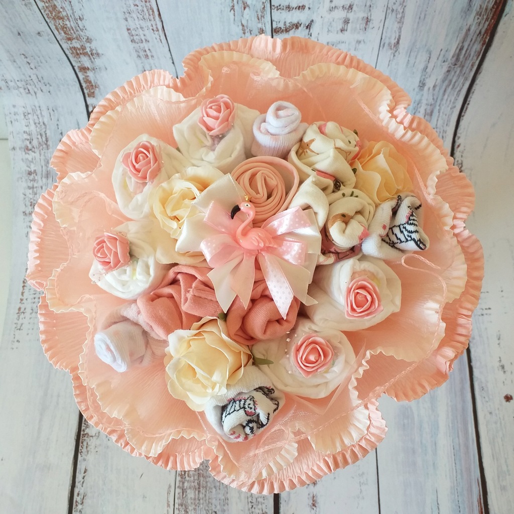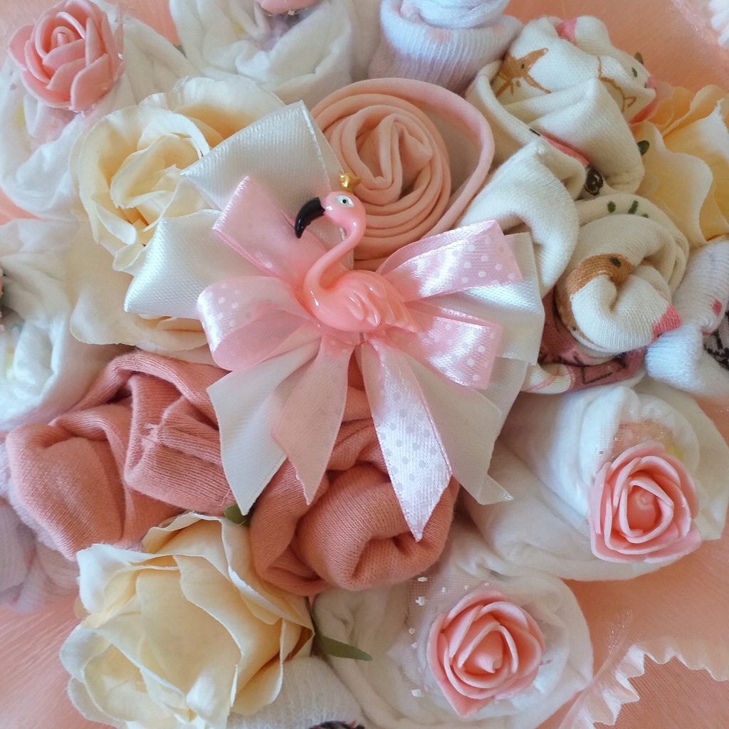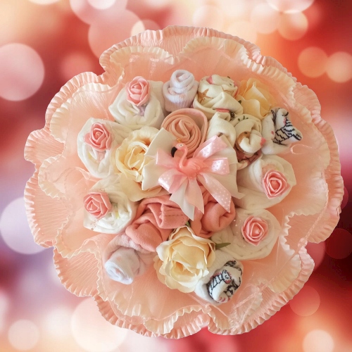 Bukiecik wykonany jest z ubranek importowanych z U.K. firmy Early Days,George lub F&F z delikatnej, dobrej jakości bawełny, 5 sztuk pieluszek Pampers Premium oraz delikatnych sztucznych różyczek.