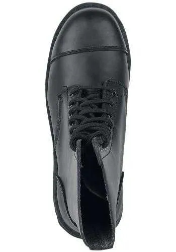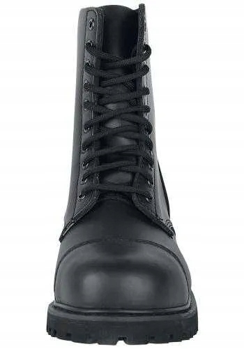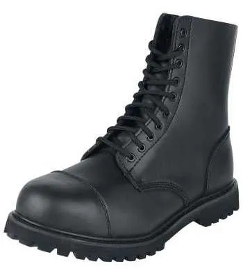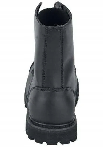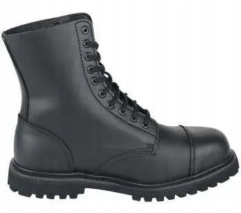 Te solidne i wygodne glany damskie i jednocześnie męskie (tzw. unisex) Brandit Phantom wykonane są z prawdziwej skóry i mają dziesięć oczek, stalową osłonę ochronną i antypoślizgową, wkręcaną i klejoną gumową podeszwę.