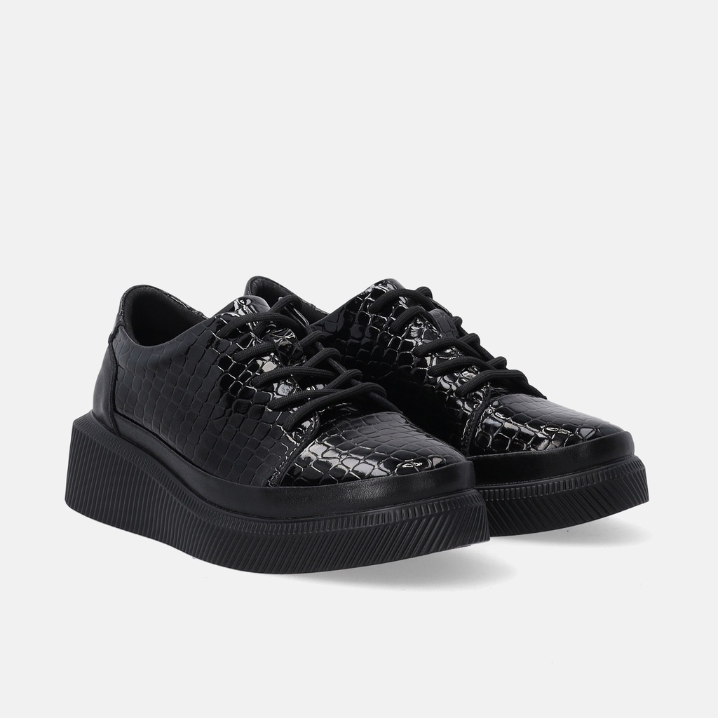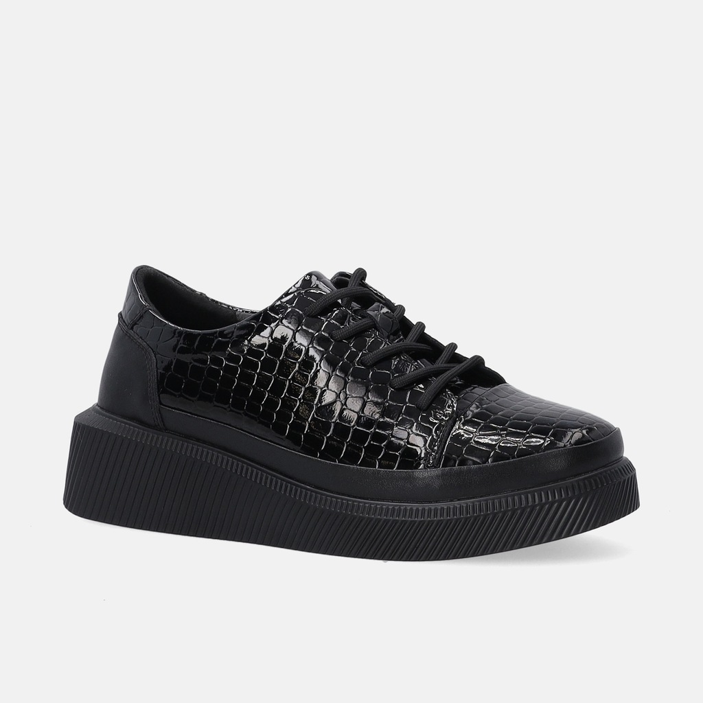 Czarne półbuty damskie wykonane ze skóry naturalnej lakierowanej. Błyszcząca cholewka oraz dekoracyjne tłocznie nada jesiennym stylizacjom modnego blasku i stylowego charakteru.