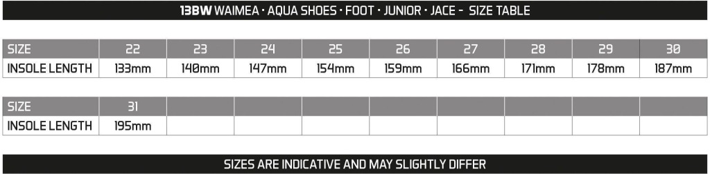 Buty do wody dziecięce, neoprenowe marki Waimea, posiadają wzmocnioną, antypoślizgową podeszwę. Stanowią doskonałą ochronę przed elementami mogącymi uszkodzić stopę, np. kamienie, muszle. Oddychający materiał zapewnia wysoki komfort użytkownika. Produkt bardzo wytrzymały, doskonale sprawdza się w podróży nad rzekę czy jeziora. Przeznaczony do użytku na plażę, po kamienistych wybrzeżach, do śliskich powierzchni i nurkowania.