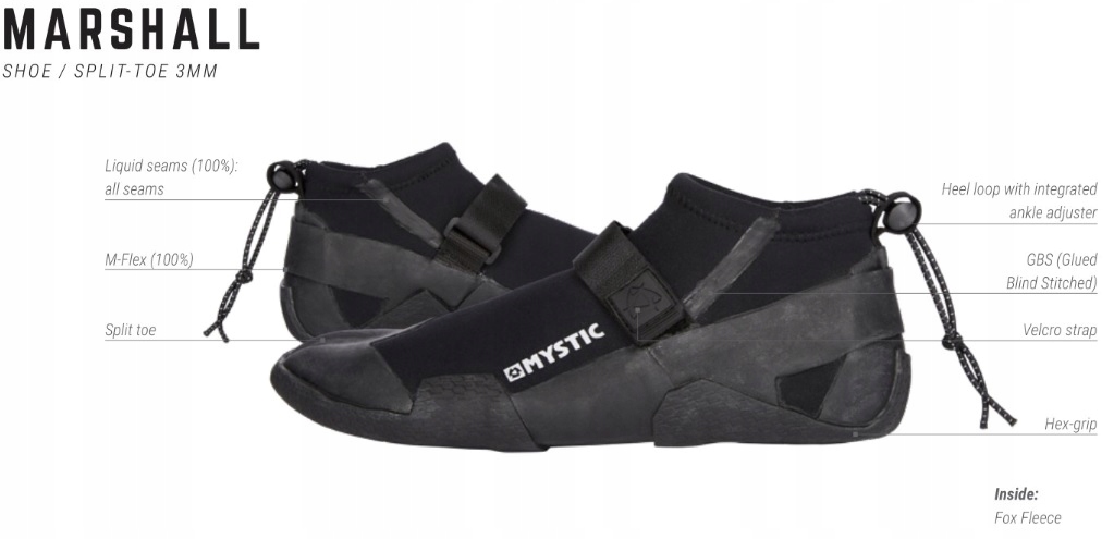 Buty Neo Mystic 2022 Marshall Shoe 3mm ST Bk Buty Neoprenowe Mystic Marshall Boot to letnia wersja butów grubości 3 mm. Wykonane z materiału M-Flex co w połączeniu z bardzo ciepłym wypełnieniem Fox Fleece zapewnią wygodę i komfort termiczny nawet najbardziej wymagającym riderom. Buty posiadają rzep znajdujący się na śródstopiu oraz pętlę na pięcie, która pomaga z zakładaniu i ściąganiu. Model Split Toe - z dzielonym palcem. Cechy charakterystyczne: