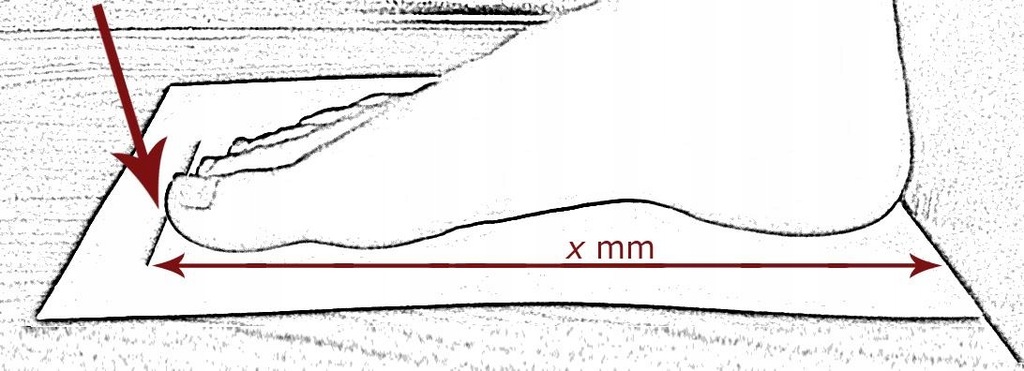 Należy zmierzyć stopę w sposób pokazany na zdjęciu, najlepiej przykładając stopę (piętę) do ściany i stając na rozwiniętym metrze.