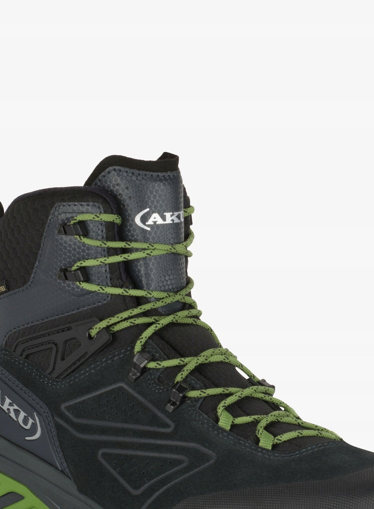 Buty turystyczne AKU Reactive GTX - dark grey/green posiadają cholewkę wykonaną z zamszu o grubości 1,6 mm ze wstawkami z tkaniny AIR 8000®. Asymetryczne sznurowanie zapewnia dokładne dopasowanie do stopy.