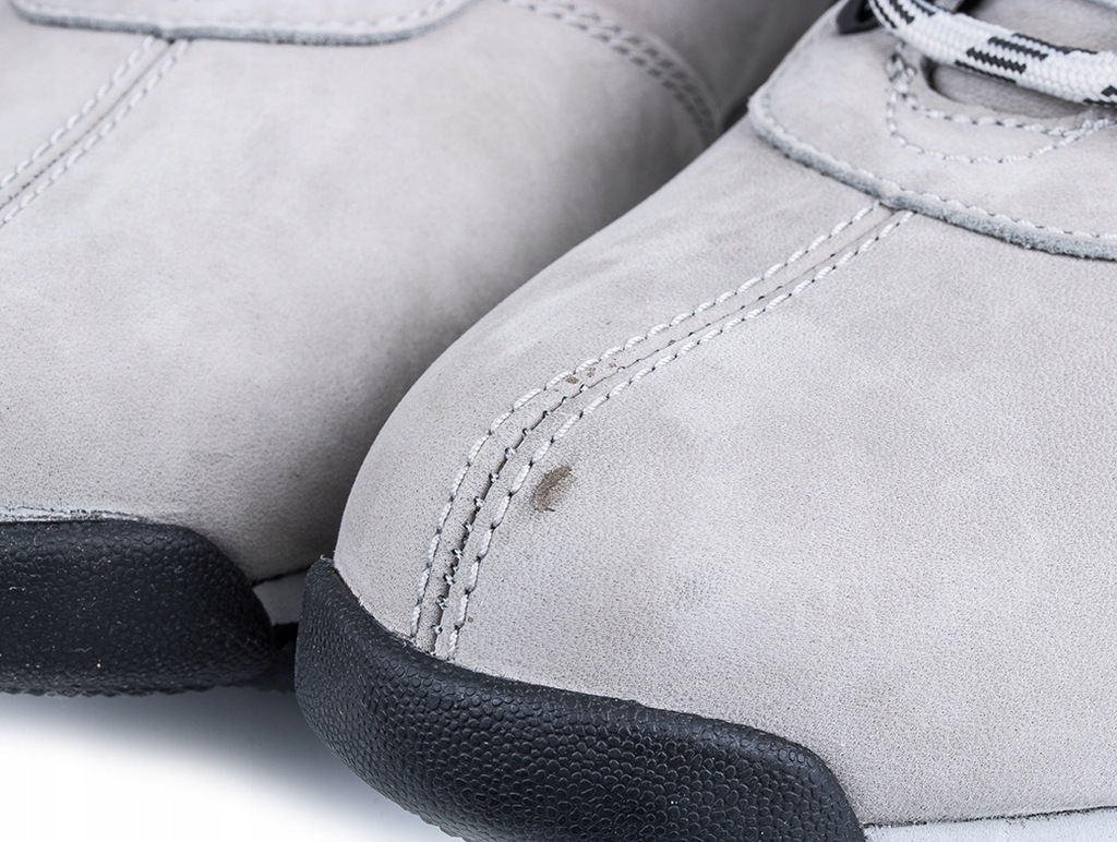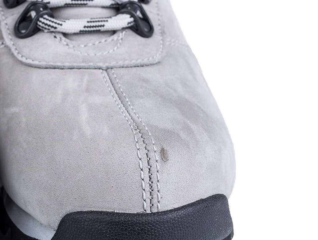 OBUWIE POSIADA SKAZY W POSTACI:SKAZY NA CZUBKU LEWEGO BUTA , DELIKATNEJ RÓŻNICY W ODCIENIU I STRUKTURZE MATERIAŁU, PRZETARĆ LUB ŚLADÓW KLEJU, KTÓRE NIE MAJĄ WPŁYWU NA UŻYTKOWANIE.