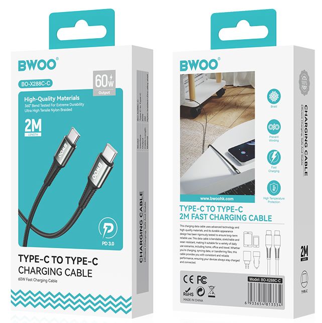 BWOO Pleciony kabel USB-C do USB-C 60W, 2 m