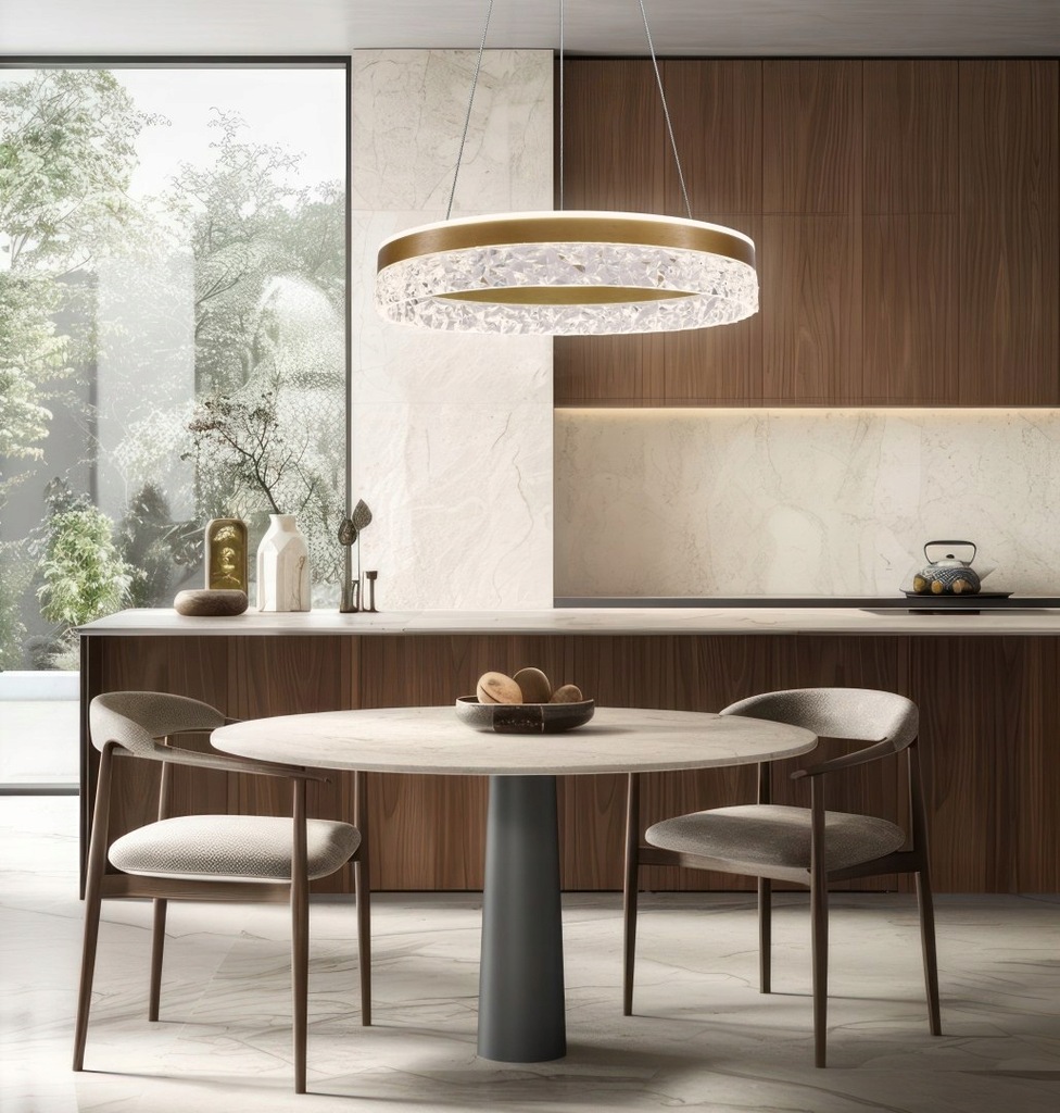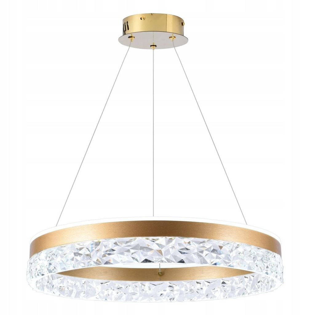 Lampa wisząca FROZI w eleganckim złotym wykończeniu to połączenie luksusowego stylu i efektownych bezbarwnych kryształków. Wyposażona w energooszczędny moduł LED o mocy 32W i ciepłej barwie światła 3000K, zapewnia przytulne i eleganckie oświetlenie. Idealna do nowoczesnych i klasycznych wnętrz, takich jak salon, jadalnia czy sypialnia, wprowadza do wnętrza odrobinę blasku i elegancji.