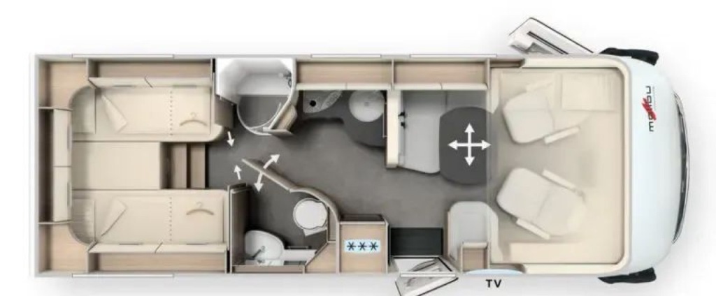 Mercedes-Benz Sprinter m40 heavy (dopuszczalna masa całkowita 4200 kg)Zwiększenie ładowności z 4200 kg na 4500 kgElektrycznie składany stopień wejściowy kabiny pasażeraReflektory główne w technologii LEDCentralny zamek drzwi mieszkalnych XL „premium two 2.0” oraz kabiny kierowcyAluminiowa markiza dachowa, materiał szary, długość 5,0 mDrugi dodatkowy akumulator 80 Ah (łącznie 2 x 80 Ah = 160 Ah)Pakiet gniazd (3 x 230 V, 2 x USB)Truma DuoControl CS (reduktor gazu z systemem bezpieczeństwa)Malibu Connect Truma iNet X Pro, kolorowy wyświetlacz dotykowy, Bluetooth, obsługa aplikacjąPiekarnik gazowy z funkcją grillaDodatkowe przyłącze TV w obszarze tylnego łóżkaŚwietlik dachowy Mini Heki nad opuszczanym łóżkiemElektryczny okap kuchennyWymiennik ciepła Alde (wykorzystanie ciepła silnika)Ogrzewanie Alde ciepłej wody, zasilanie gaz/230V z boosterem w kabinie kierowcyWzór wnętrza BellagioDywan do części mieszkalnejDywan do kabiny kierowcyBoczne siedzenie możliwe do przekształcenia na 5 miejsce z pasem bezpieczeństwa dwupunktowymKombinacja tkanin „London”Zestaw dekoracyjny Malibu do spania: poduszki dekoracyjne, koc, zestaw prześcieradeł dopasowanychNa samochód wystawiamy fakturę VAT 23%. Podana cena jest ceną brutto