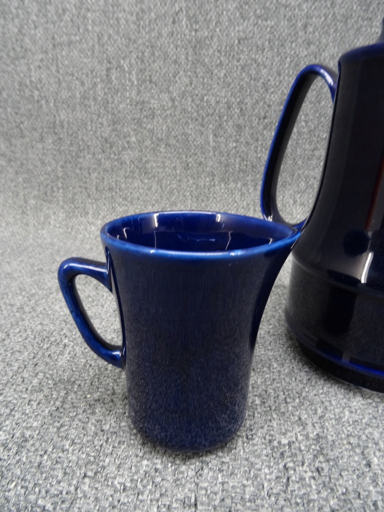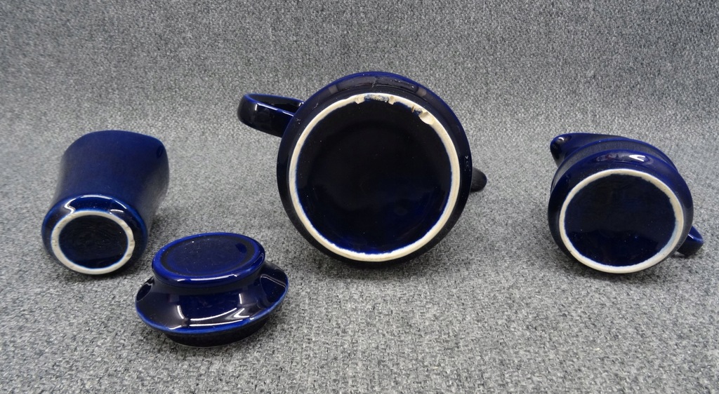 Stan: używany, widoczne nieduże skazy produkcyjne- na mleczniku kropkowanie szkliwa, na rancie kubka nieduże wytarcie, na spodach kubkach i dzbanka odbicia. Wygląd jak na zamieszczonych zdjęciach.