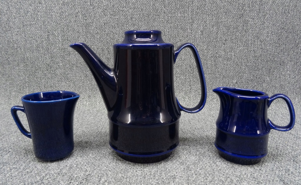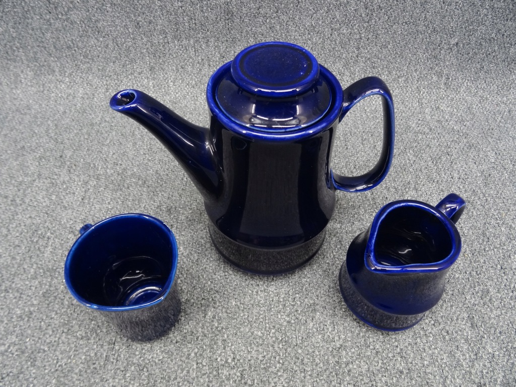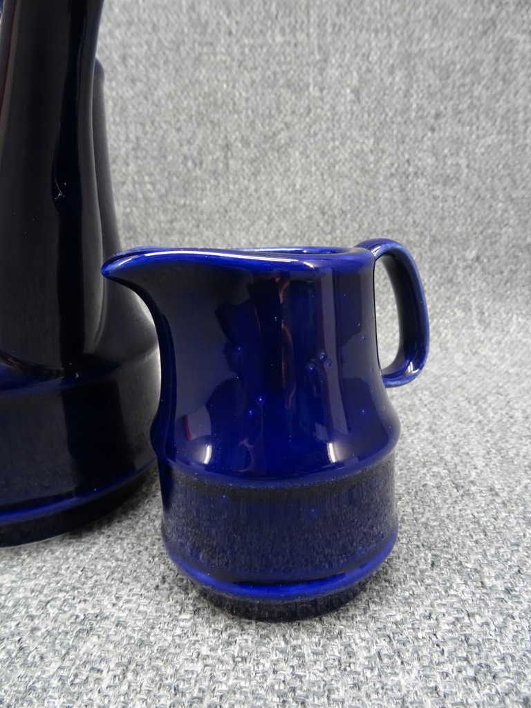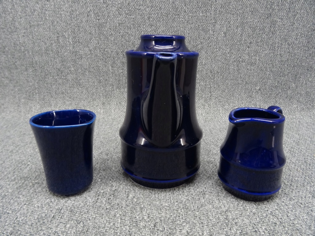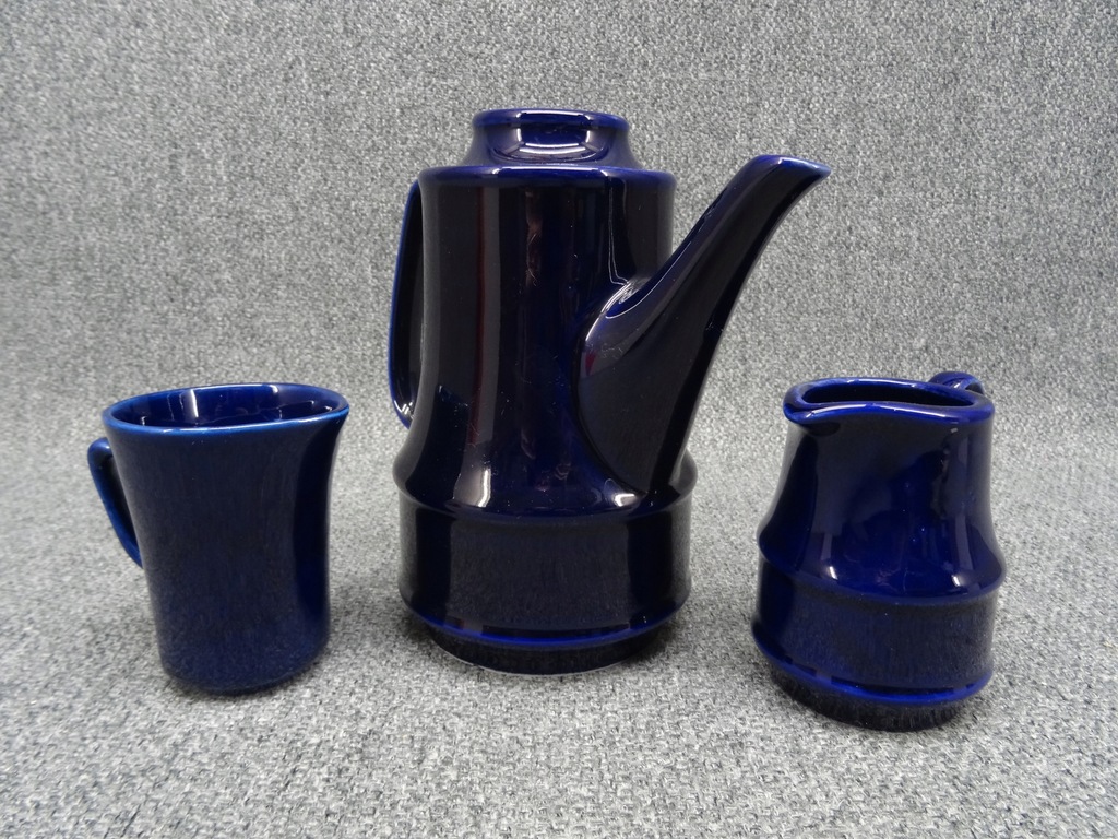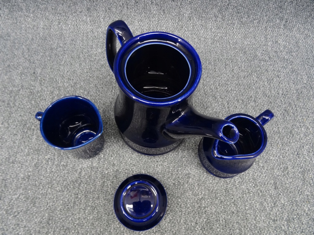 Ceramiczny serwis w kolorze niebieskim. Trzyczęściowy; dzbanek, mlecznik, kubek.