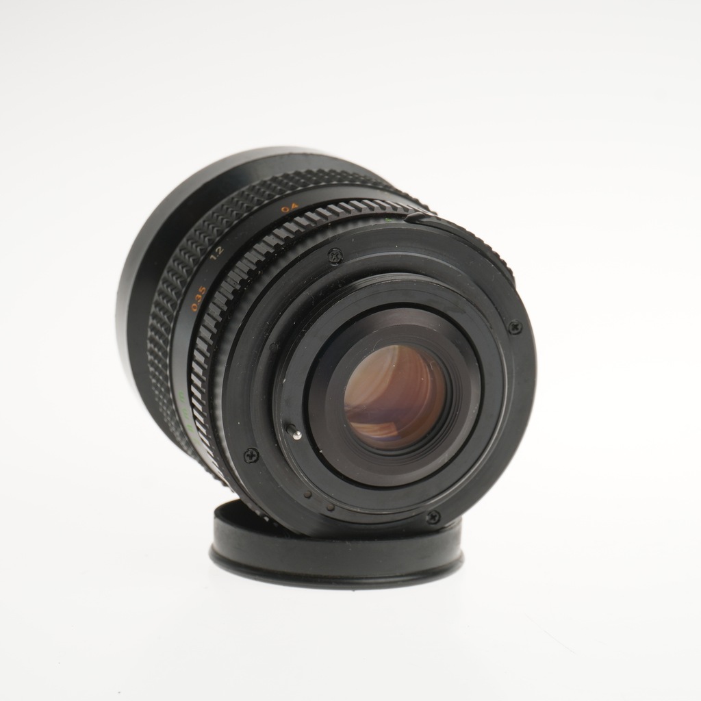 Obiektyw w bardzo dobrym stanie, pierścienie nastaw pracują prawidłowo, przysłona czysta i sprawna, tylna i przednia soczewka czysta, wewnątrz przy brzegu widoczne smugi drobnych kropeczek. W zestawie tylny dekielek i osłona przeciwsłoneczna.