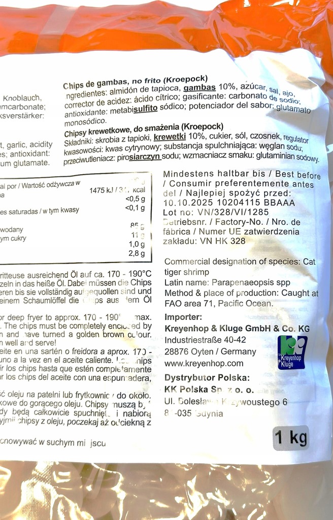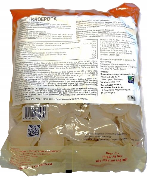 Składniki: skrobia z tapioki, krewetki 10%, cukier, sól, czosnek, regulator kwasowości: kwas cytrynowy; substancja spulchniająca: węglan sodu; przeciwutleniacz: pirosiarczyn sodu; wzmacniacz smaku: glutaminian sodu