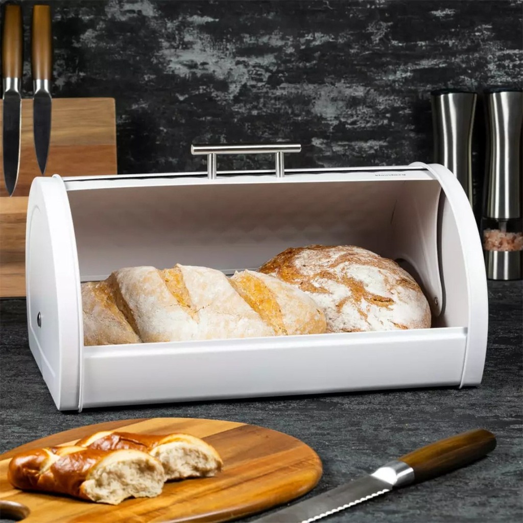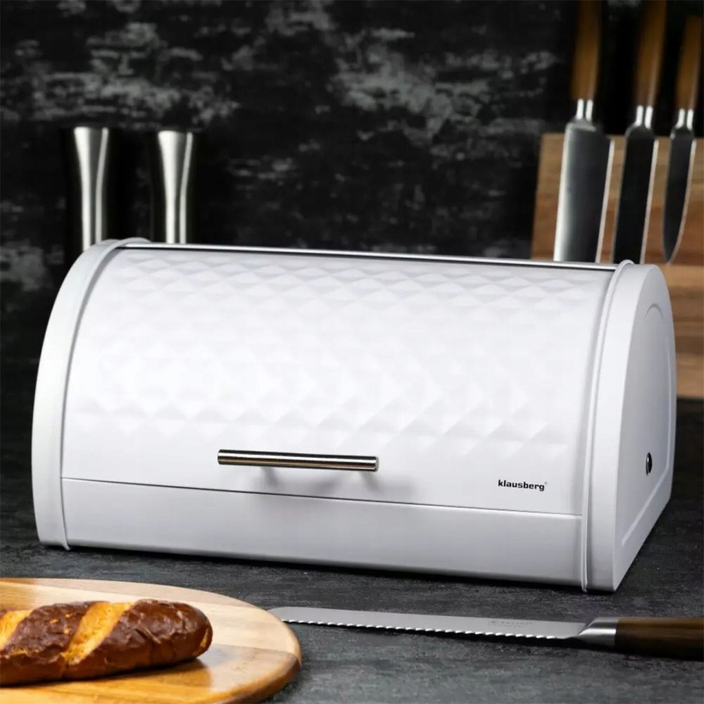 Chlebak o futurystycznym, nowoczesnym kształcie w klasycznej i uniwersalnej kolorystyce. Korpus produktu został wykonany z solidnego i trwałego metalu w białym wykończeniu. Posiada wygodną metalową pokrywę z również metalową rączką. Pokrywa z wykończeniem nawiązującym do diamentu nadaje chlebakowi oryginalnego charakteru.